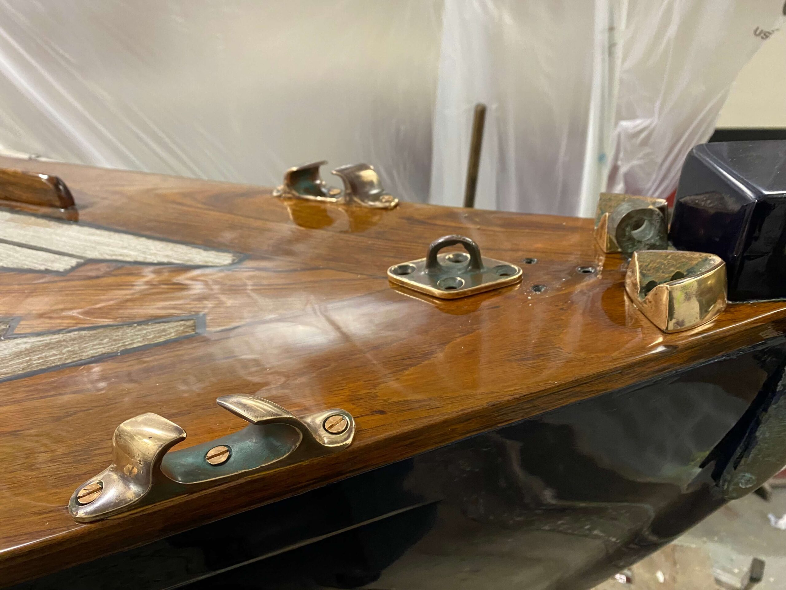 Throughout January and February the hull has been repainted and the beautiful classic Davey & Co fittings have been refitted. Her transformation has been remarkable. She is soon to be moved out of the boatshed and her mast and rigging reinstated and her hull finished with a final coat of antifoul prior to launching.
