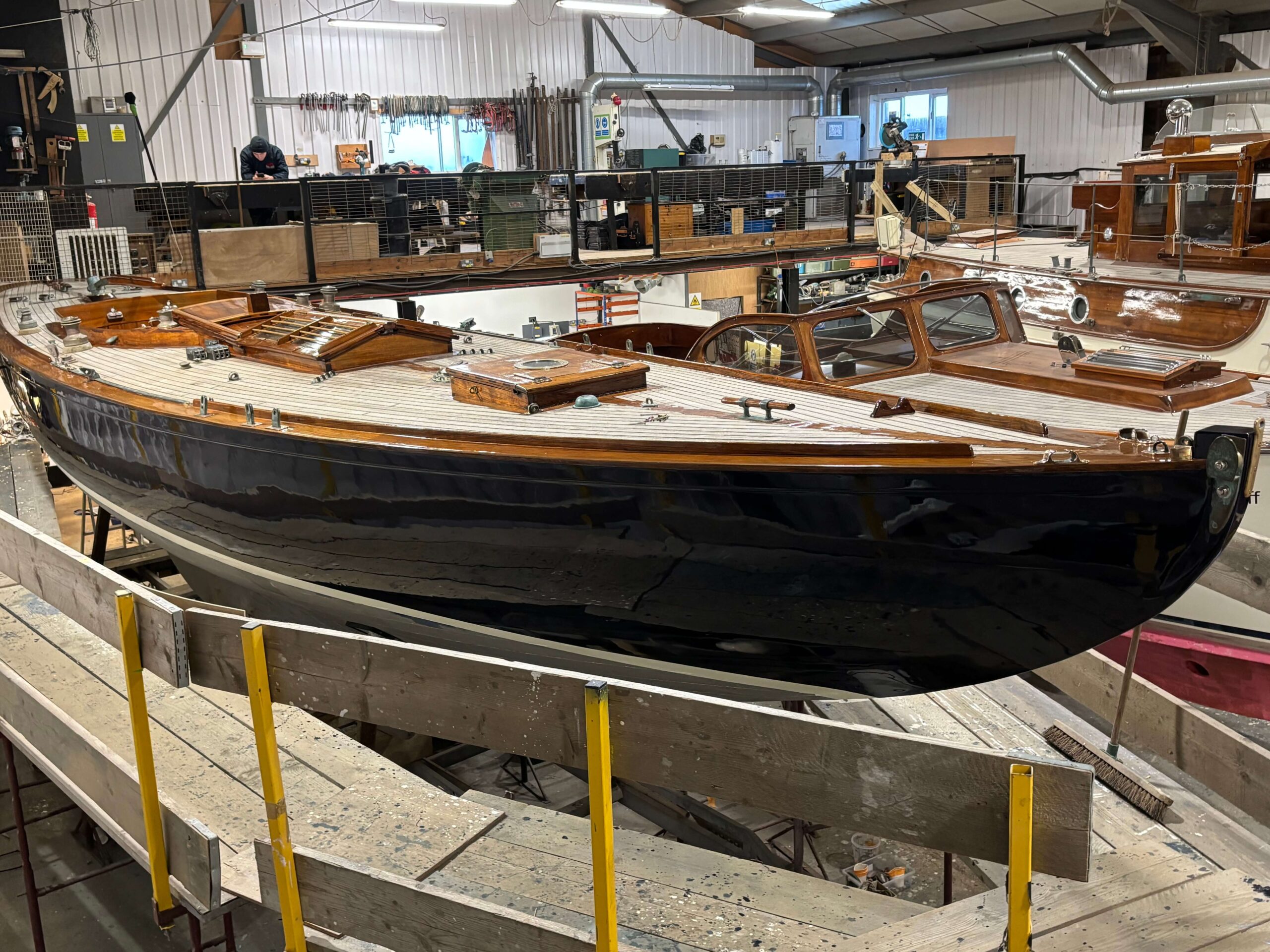 Throughout October and November the HMS team have been busy filing, fairing, priming and varnishing Benita’s hull and topsides and the transformation is in full swing, her elegant lines are starting to shine once again.