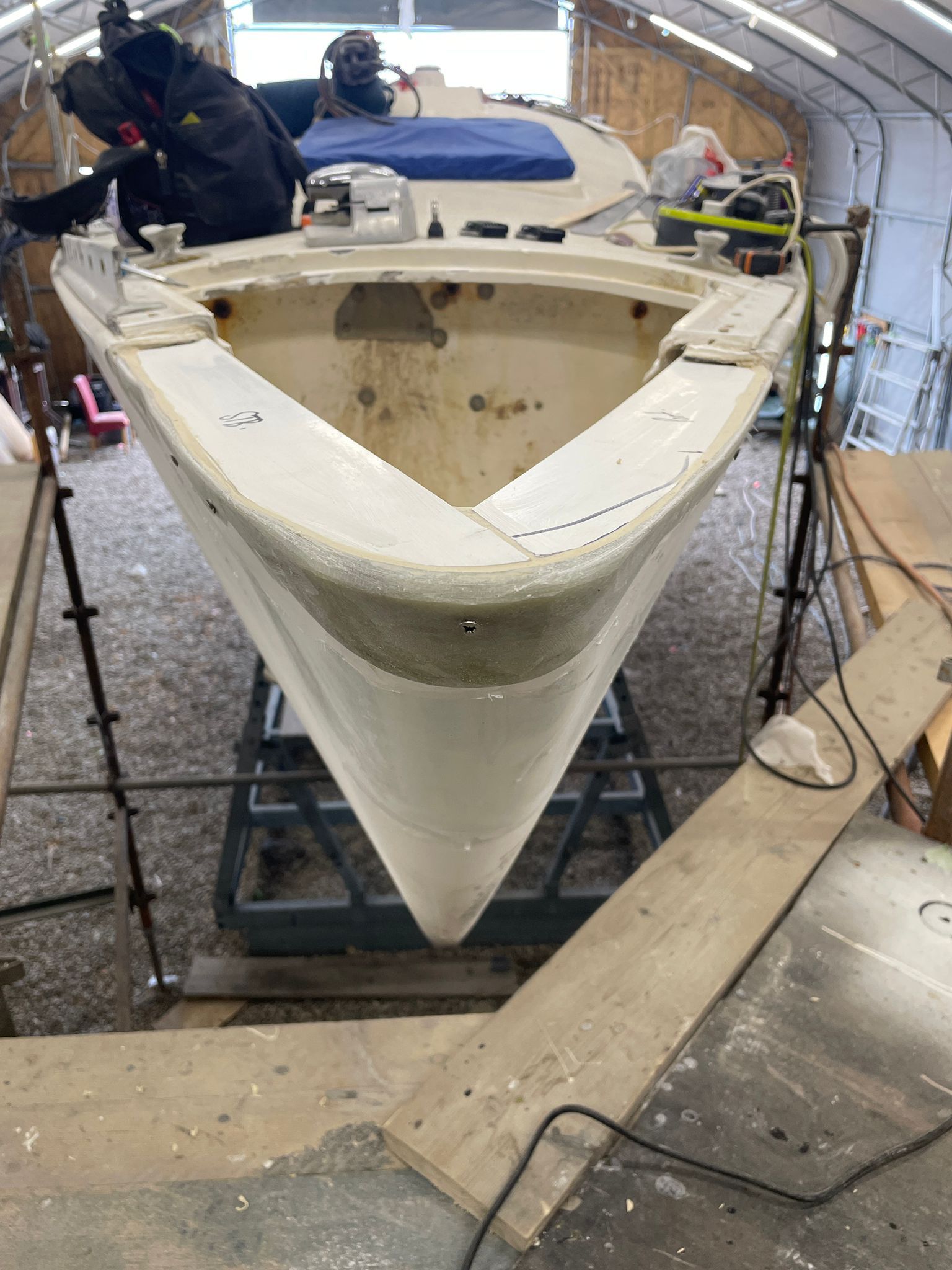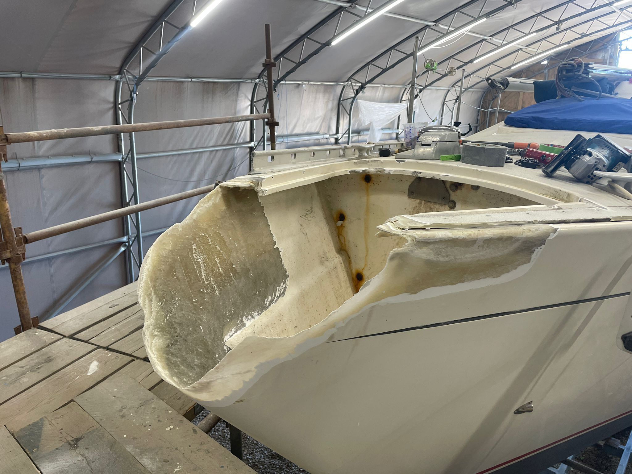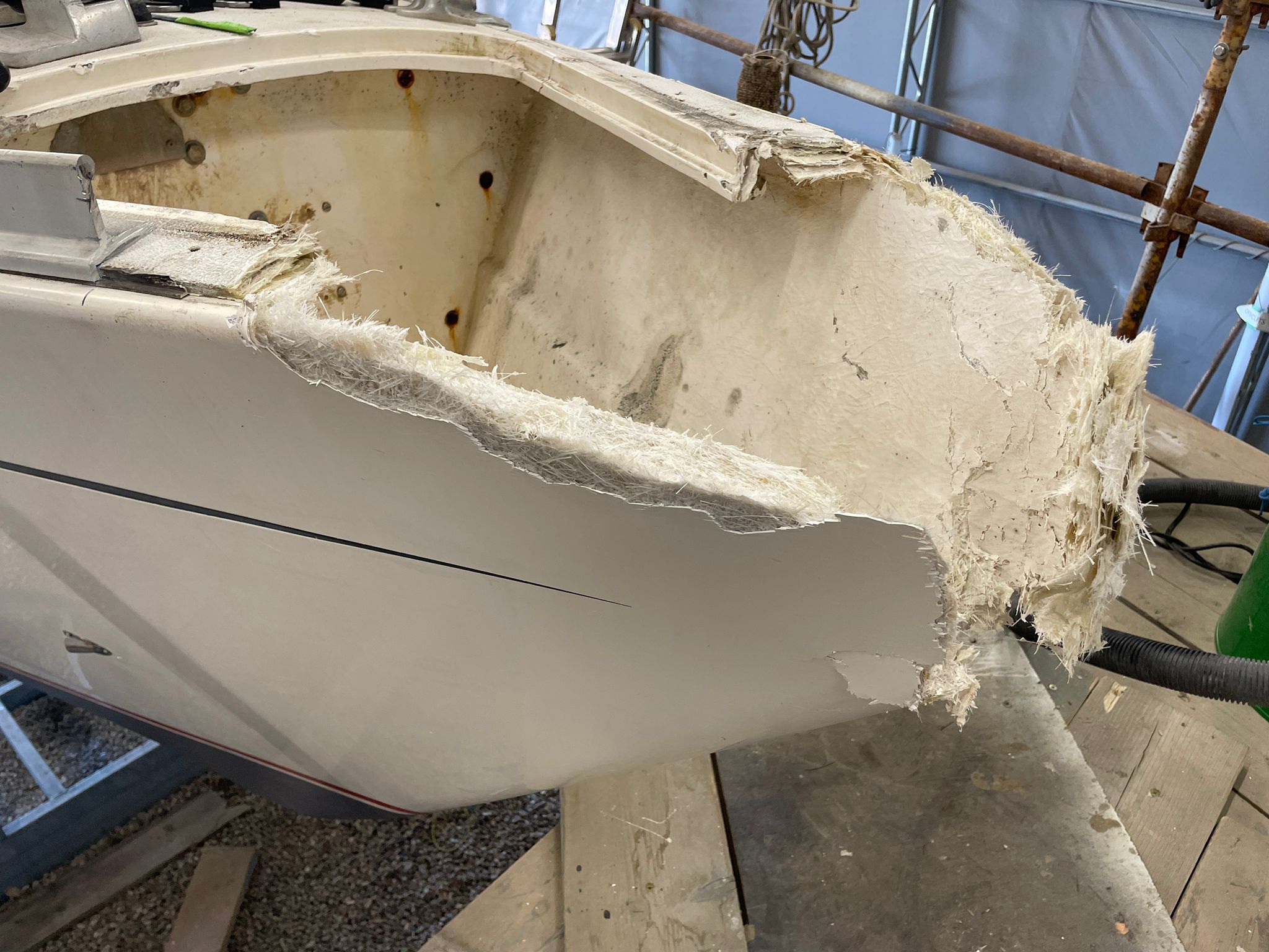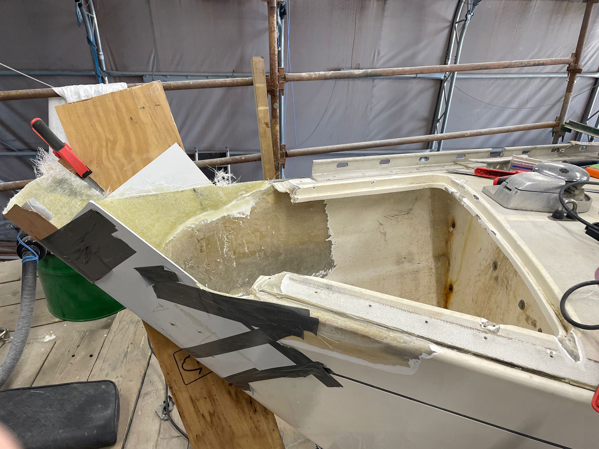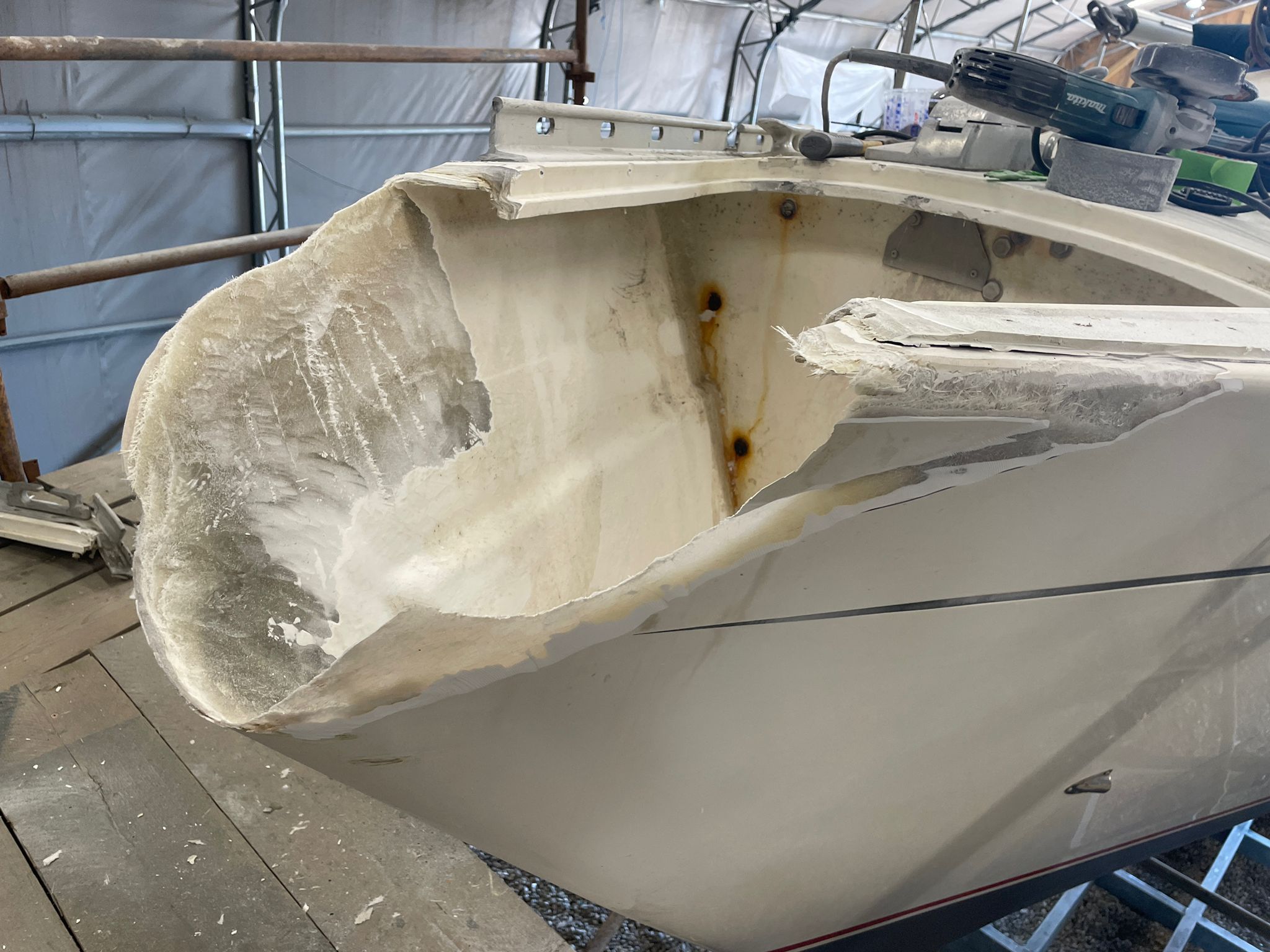 She was involved in a collision with a navigation buoy (many said it was a great white shark!) and sustained some extensive damage to the bow and pullpit area. This was no problem for the team at Ipswich, firstly we had to cut away the damaged section and then we have rebuilt the bow using chop strand mat and west epoxy.