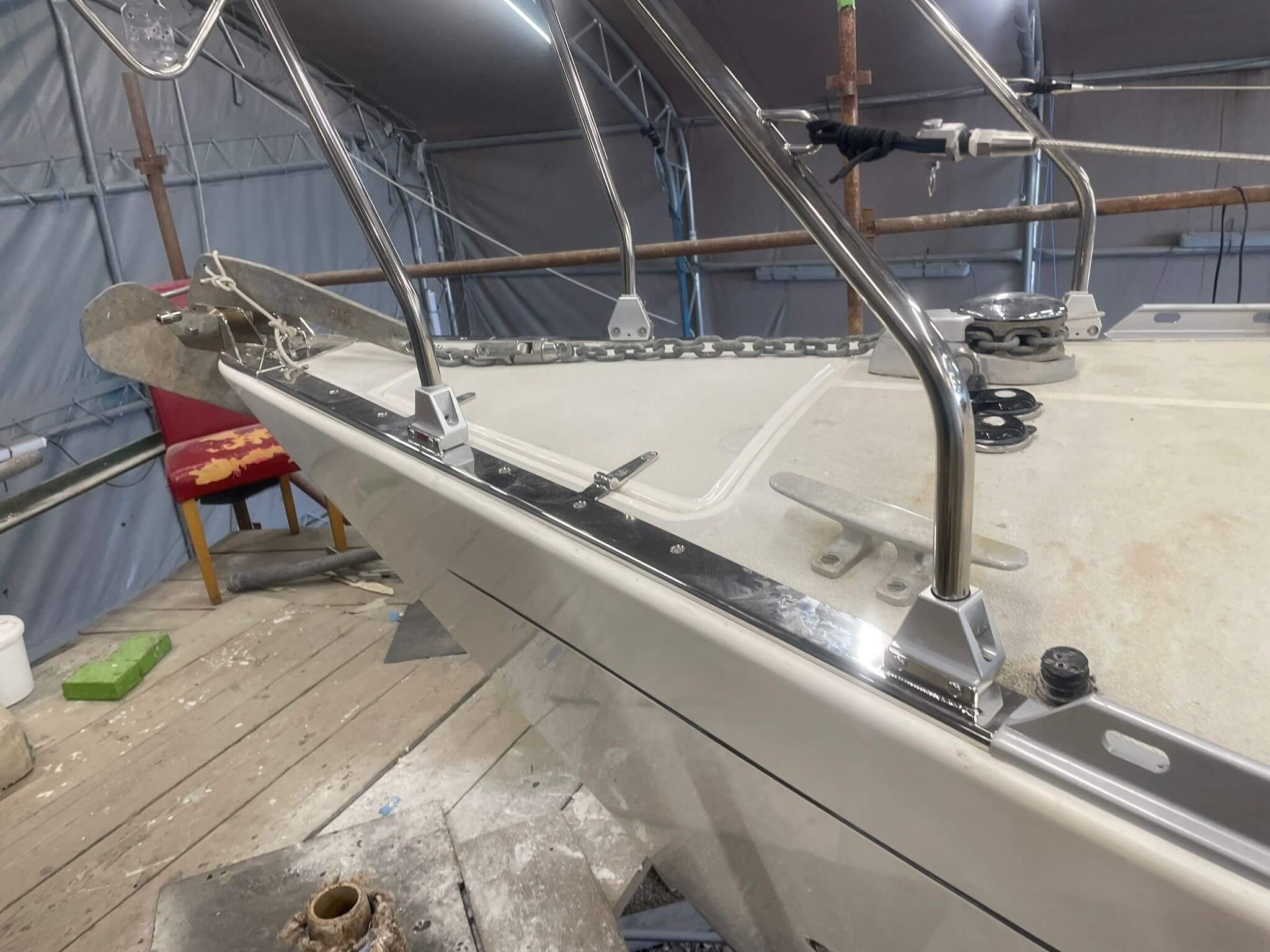 With the hull repairs completed and the pulpit and bow roller back in place Cosmic Dancer was launched and looked as good as new.
