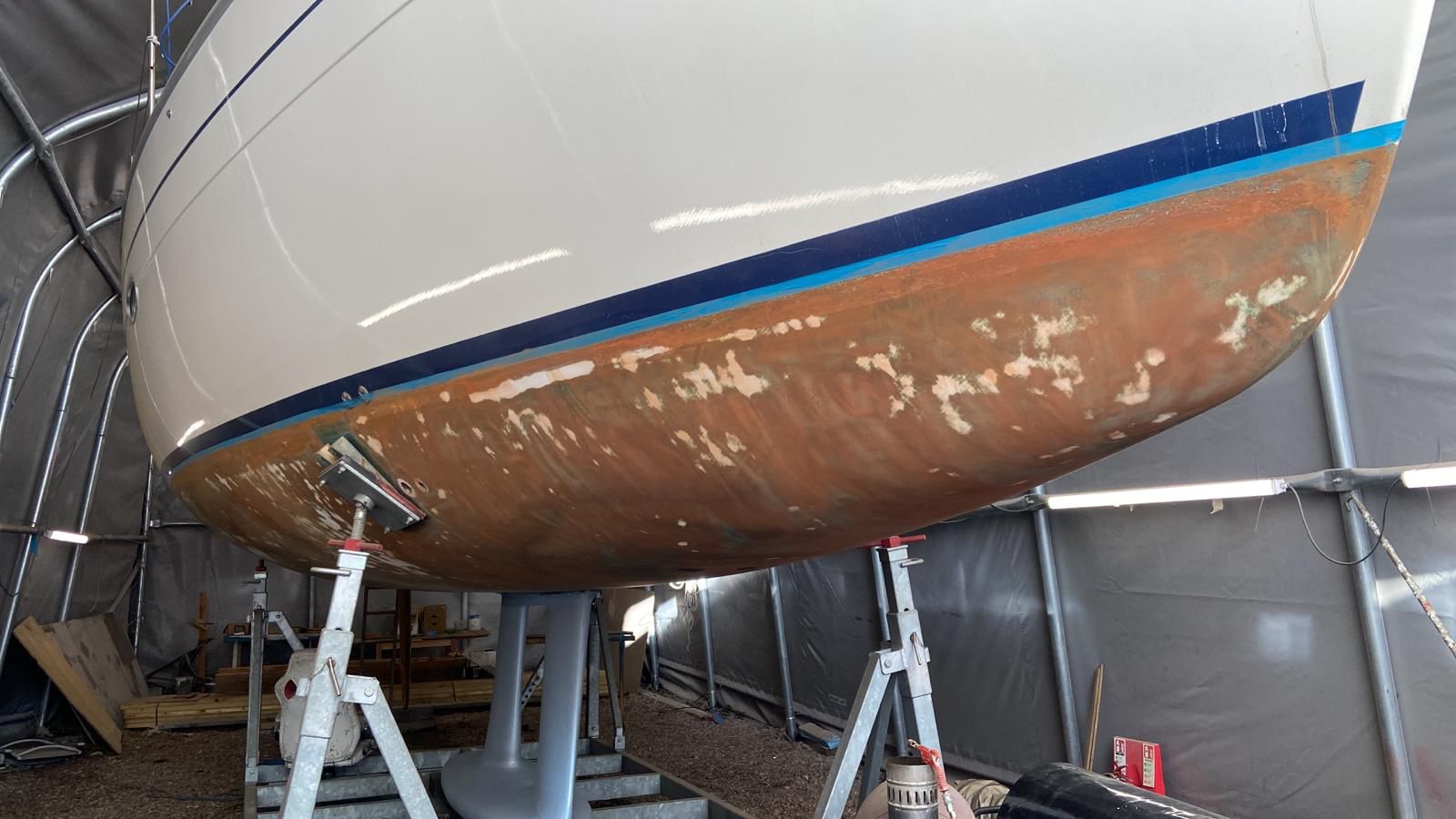 ‘First Lights’ hull having had the anti foul removed ready for applying the copper coat.