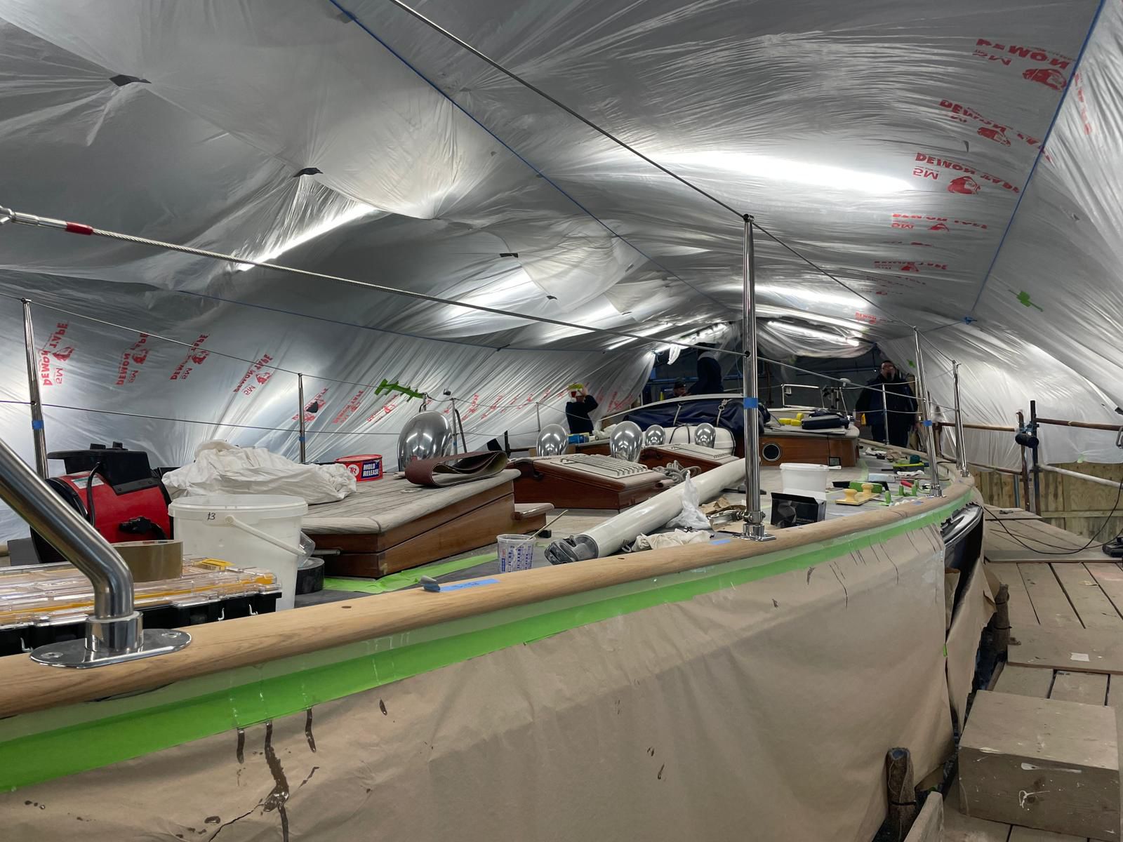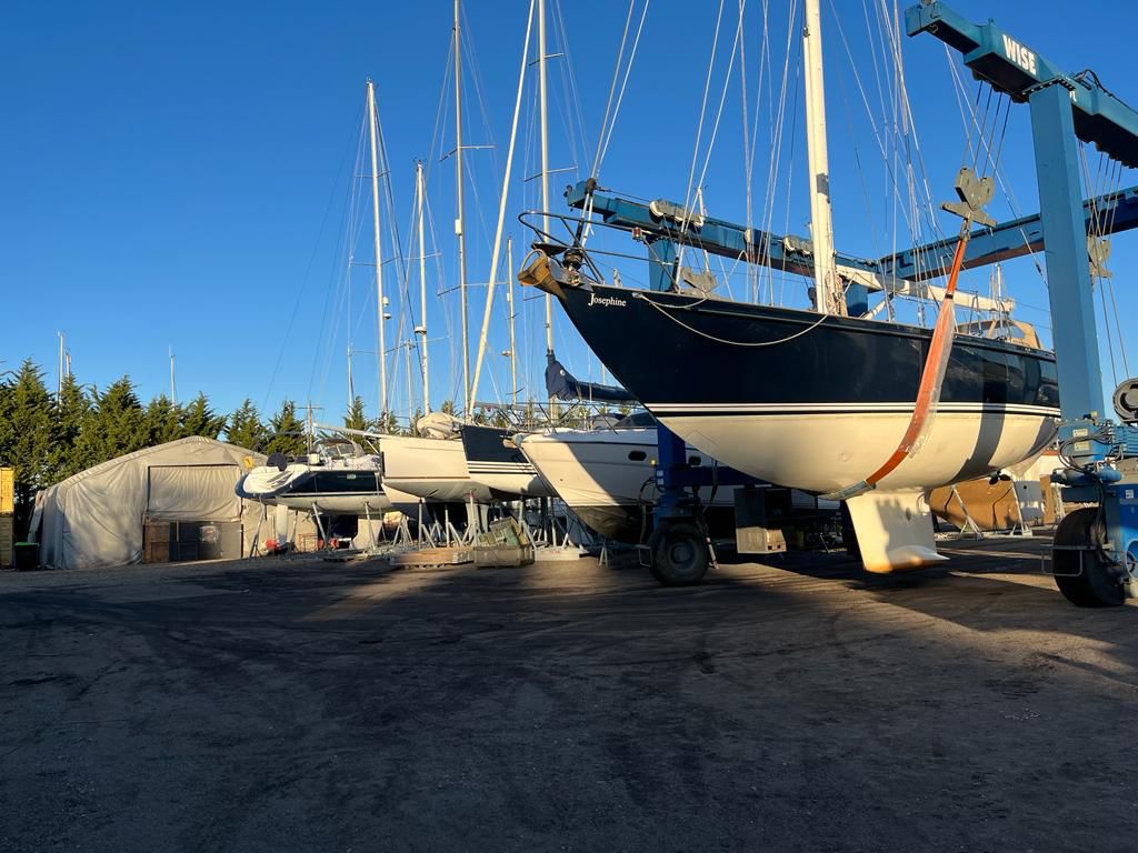 A familiar face at HMS over the years Josephine has returned to our Ipswich yard for some winter maintenance works, including a gentle refurb of her teak decks and all the brightwork being revarnished using Allwood. Then we are respraying her port hull and giving her a polish and antifoul. She is also having some electrical works carried out and a new heater installed along with the usual list of winter jobs. Keep up with her progress here.
