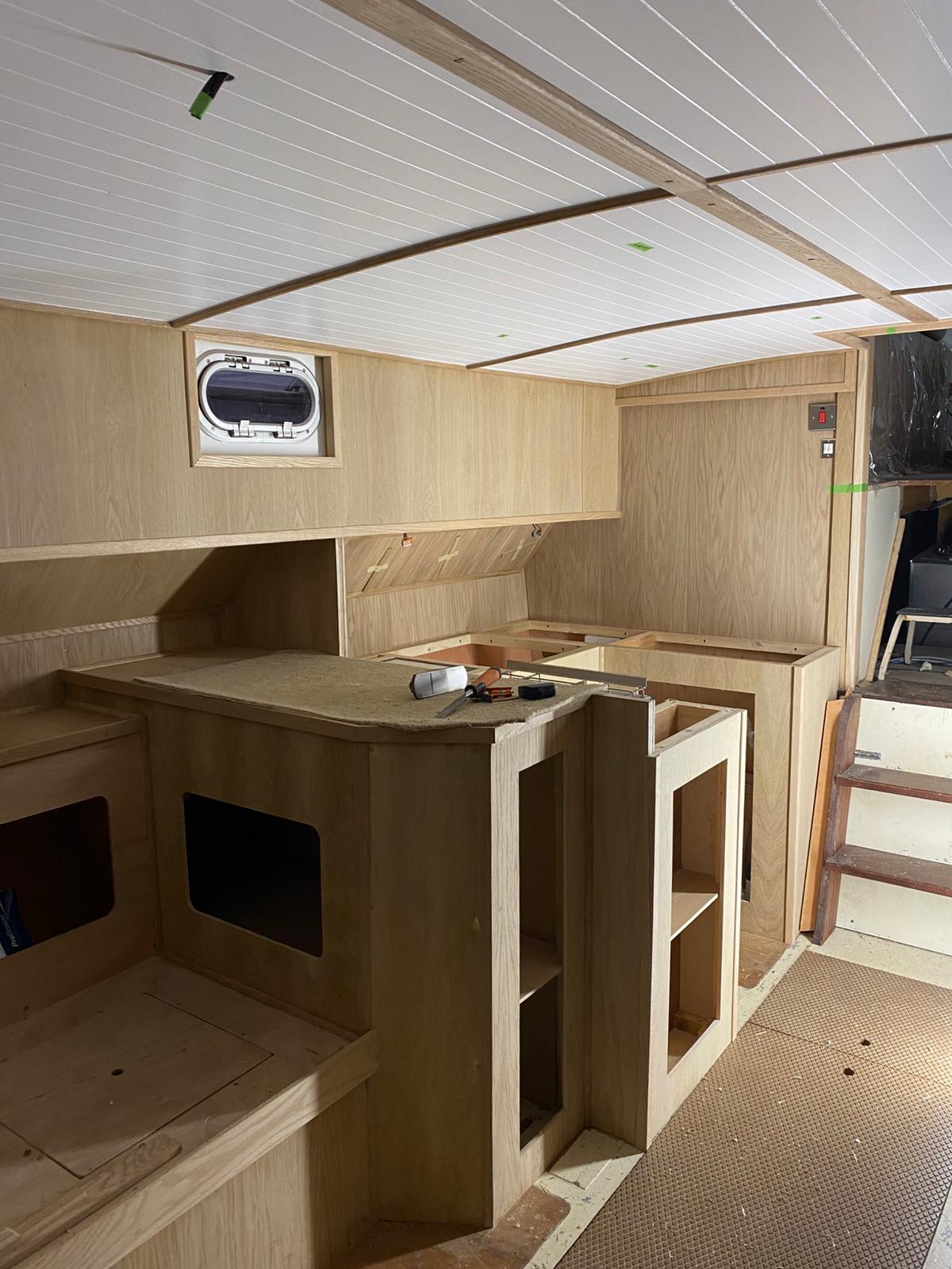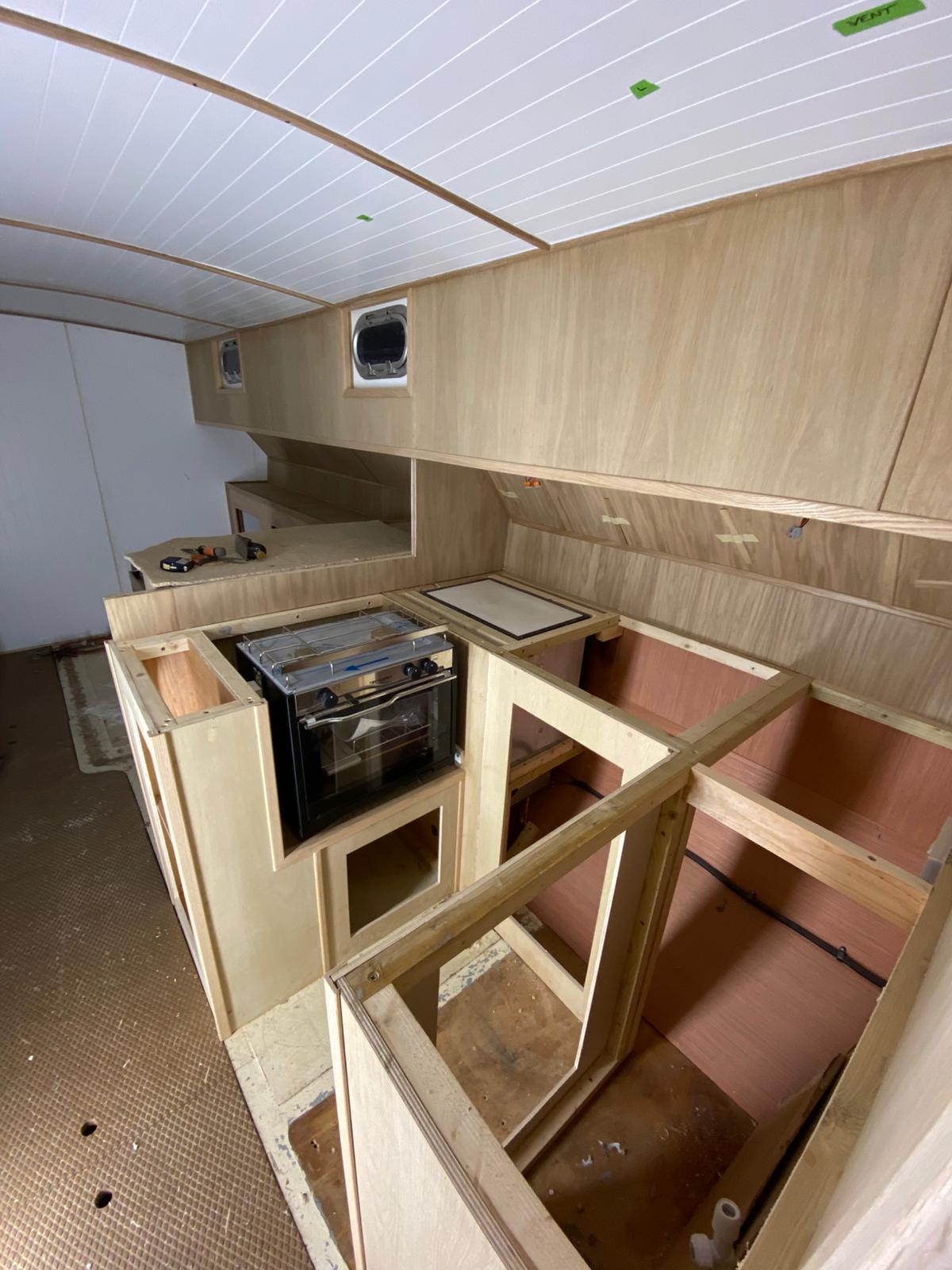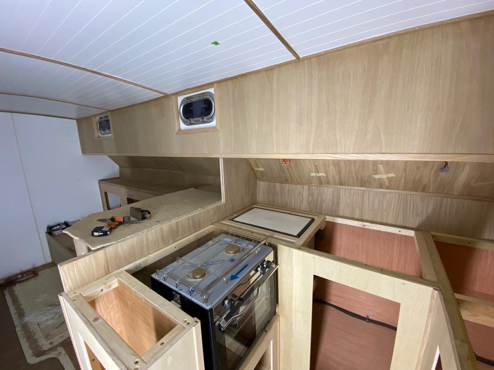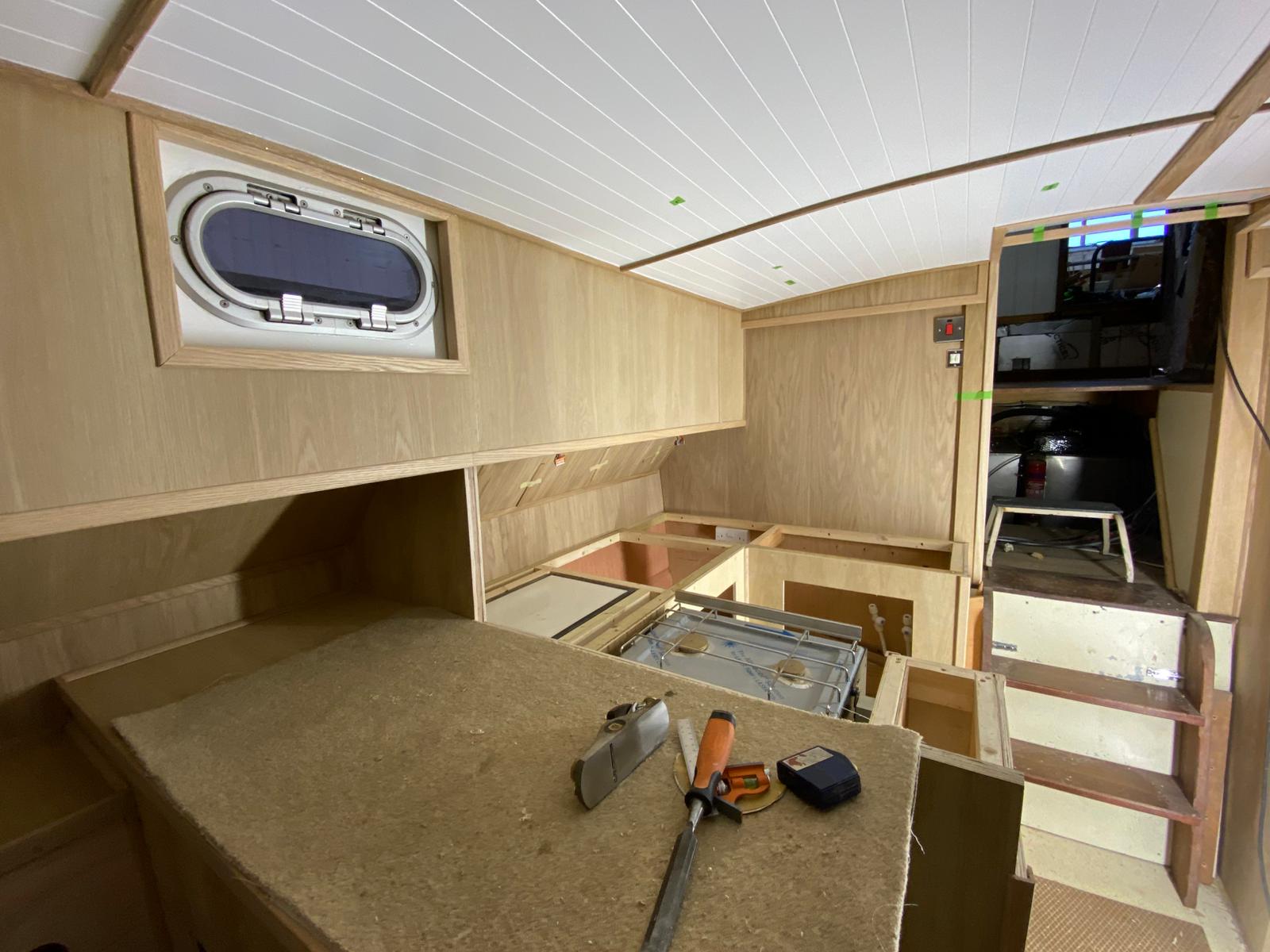 Great progress is being made on the interior fitting out and the completion is in sight. The oak faced ply has given the interior a nice light feel.