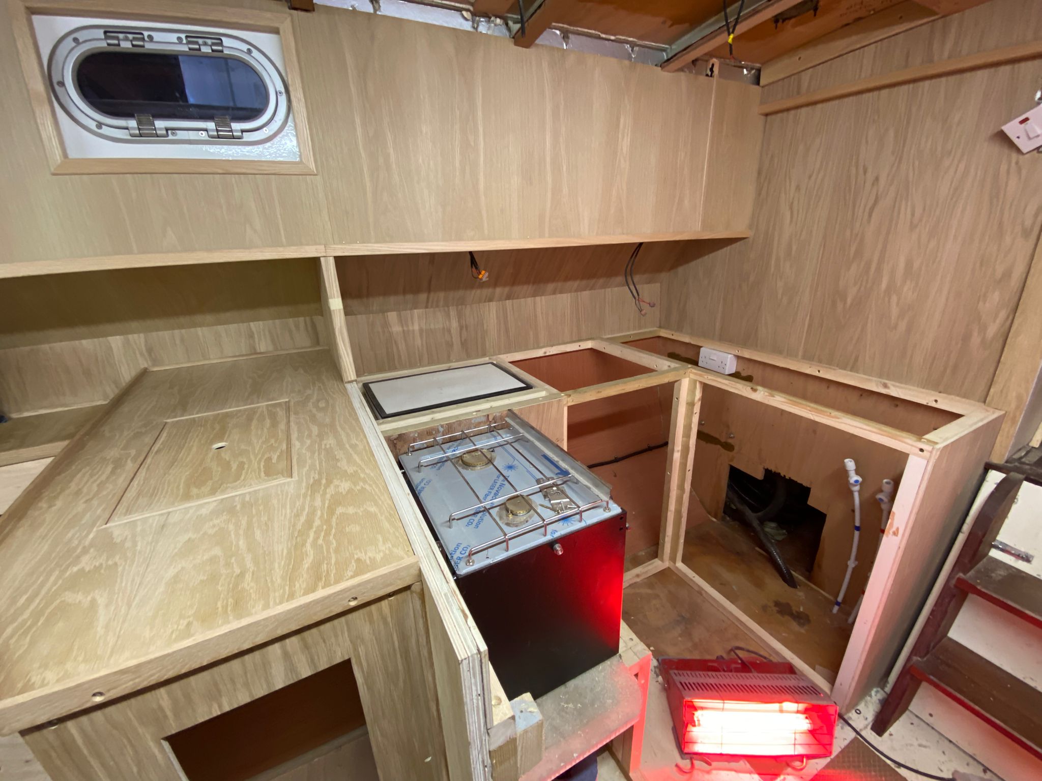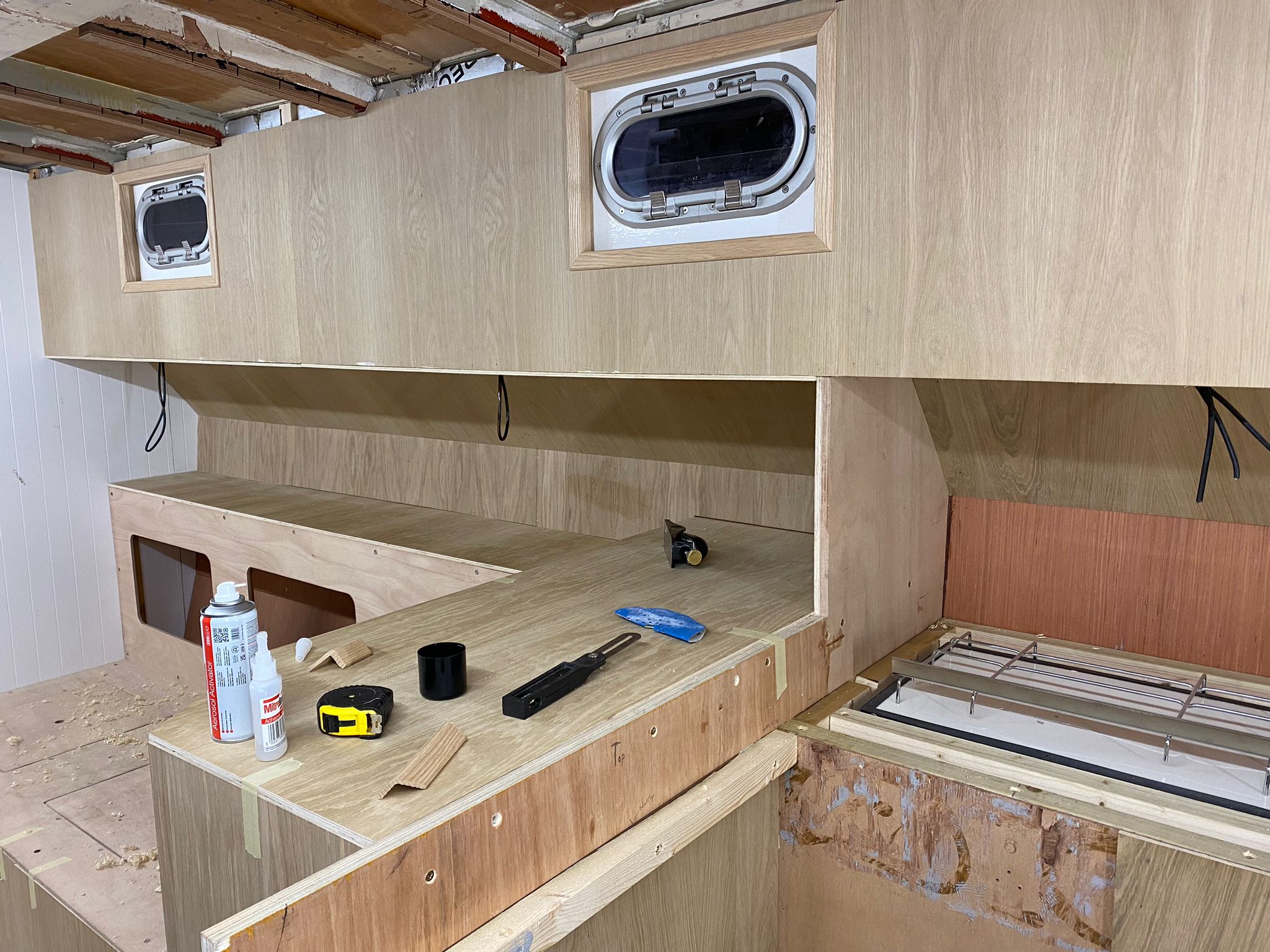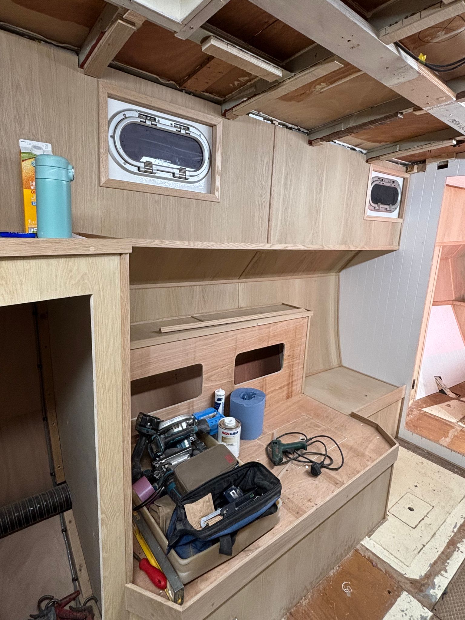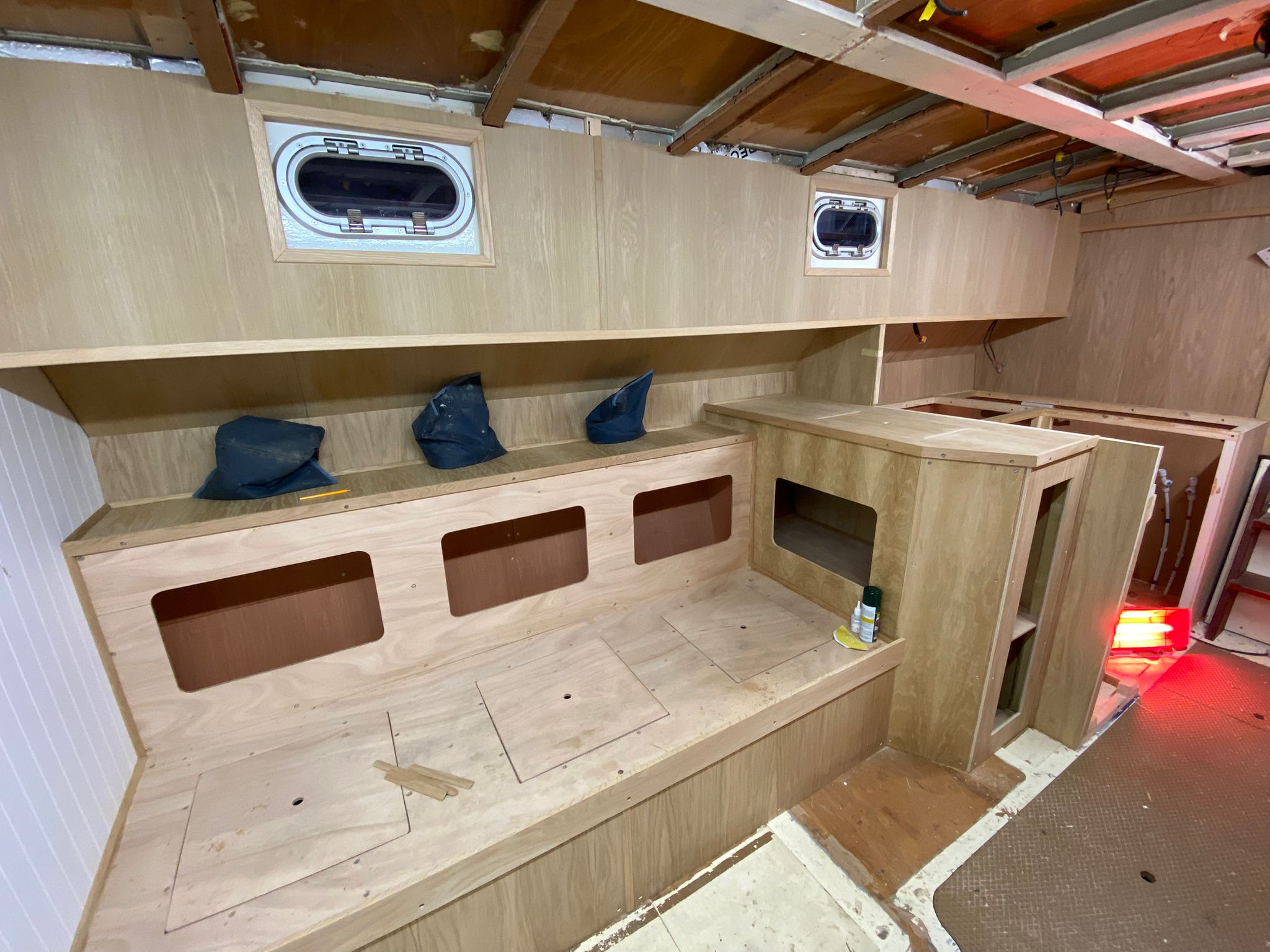 Great progress is being made on the interior fitting out and the completion is in sight. The oak faced ply has given the interior a nice light feel.