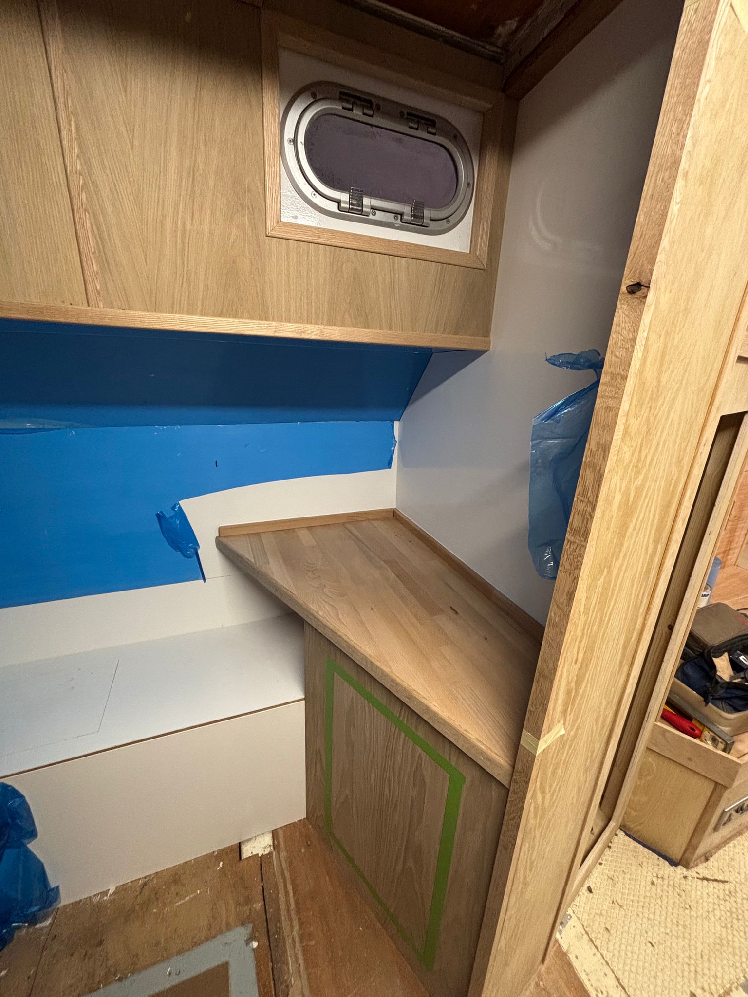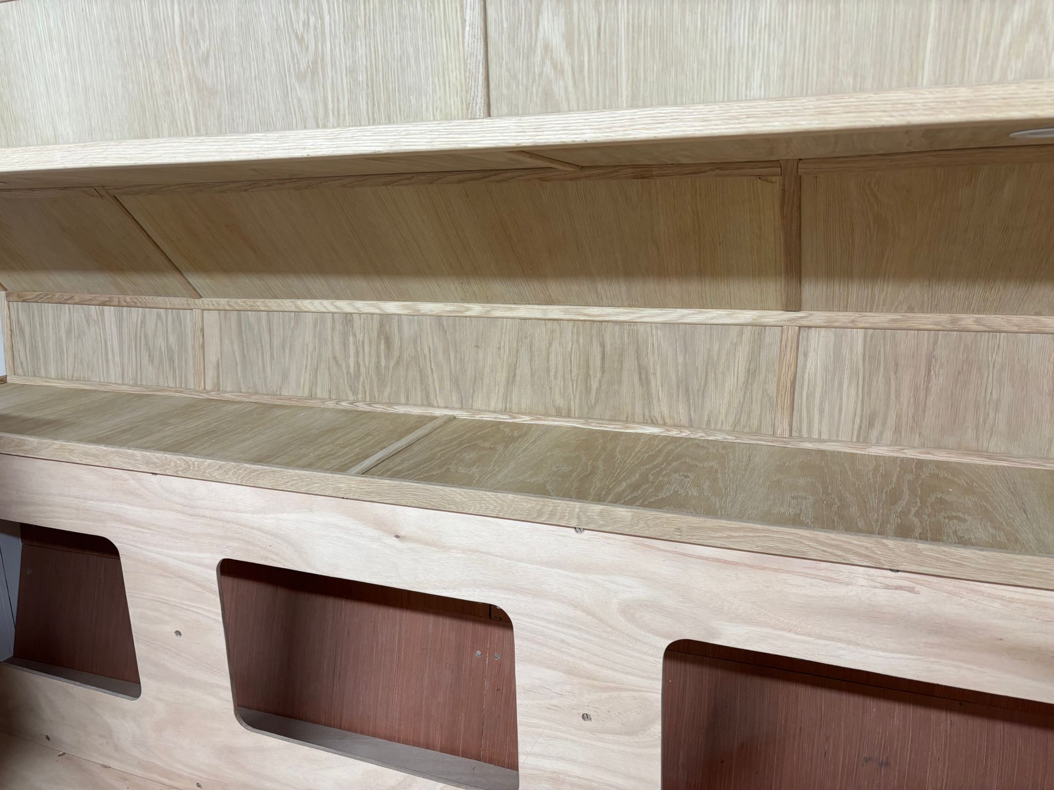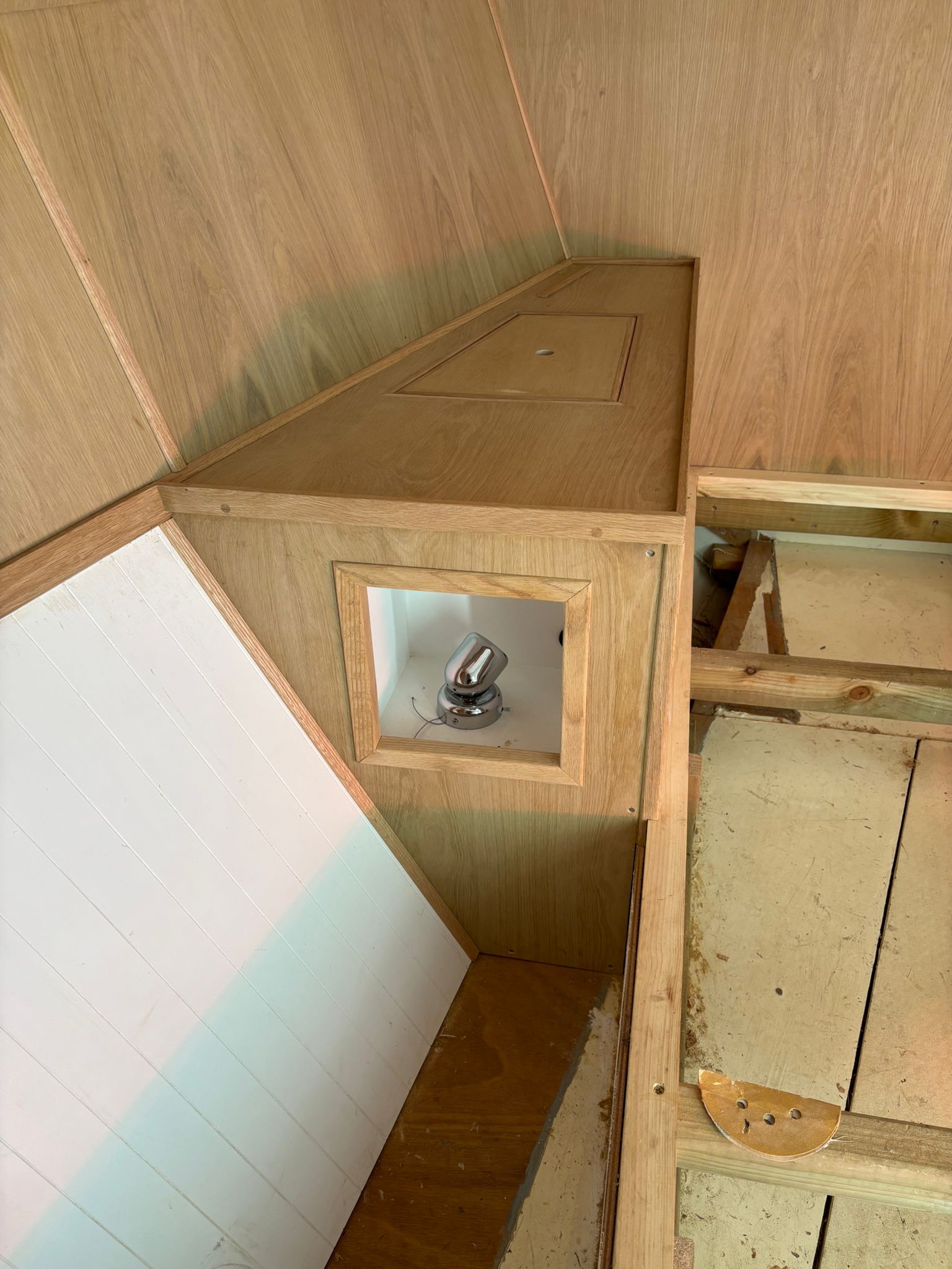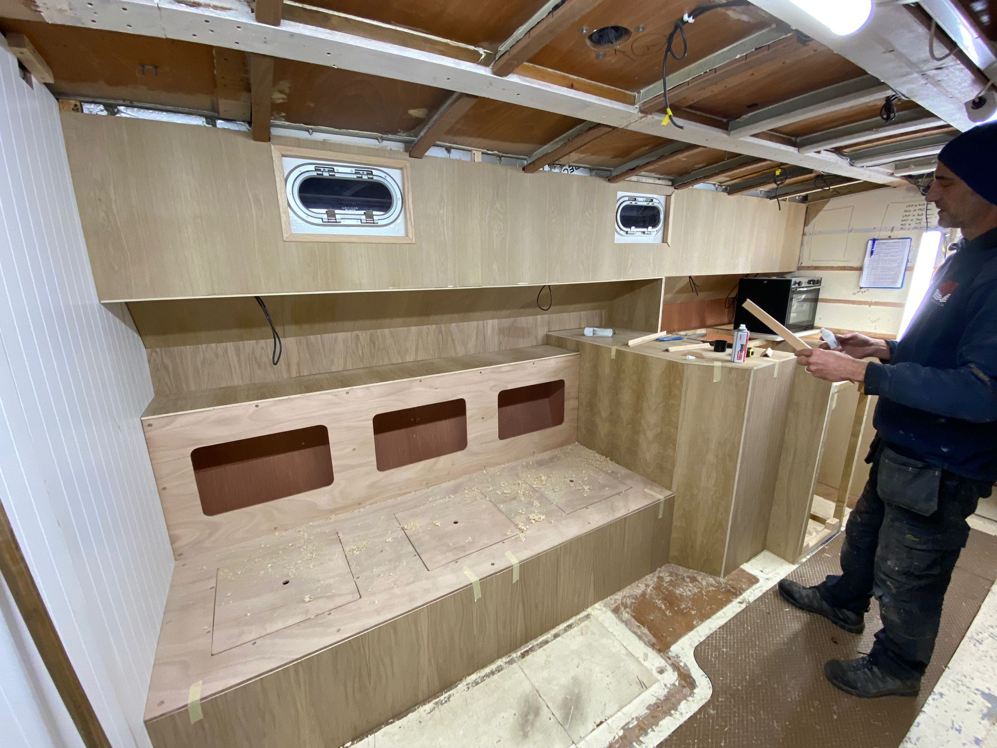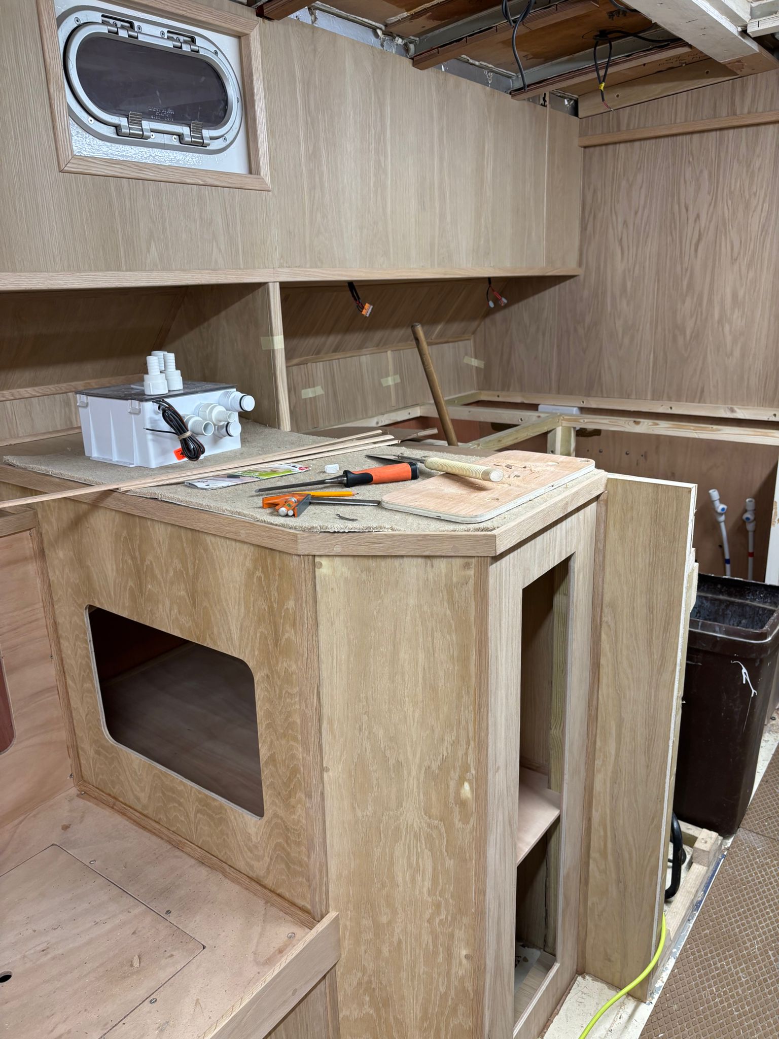 Great progress is being made on the interior fitting out and the completion is in sight. The oak faced ply has given the interior a nice light feel.