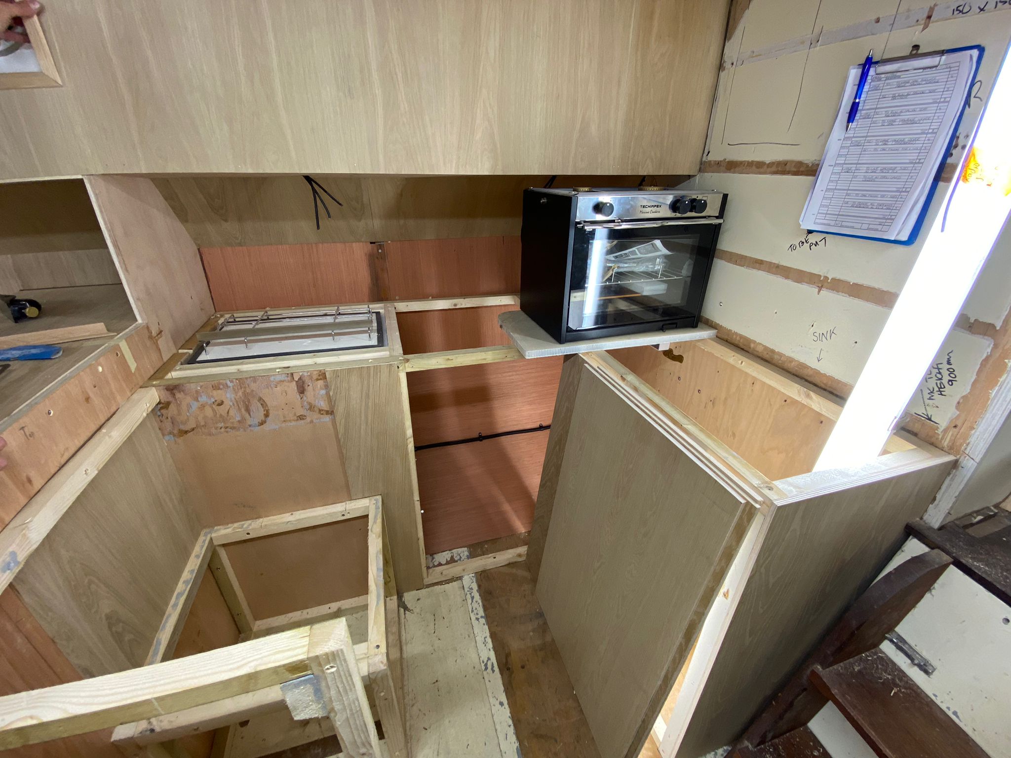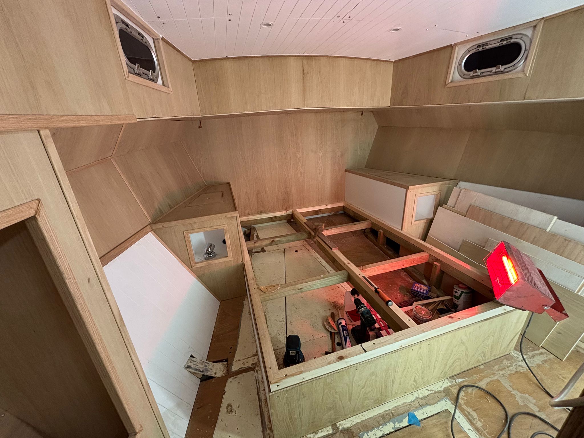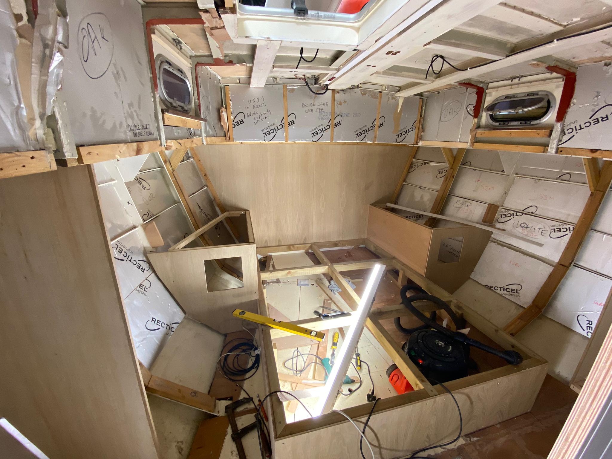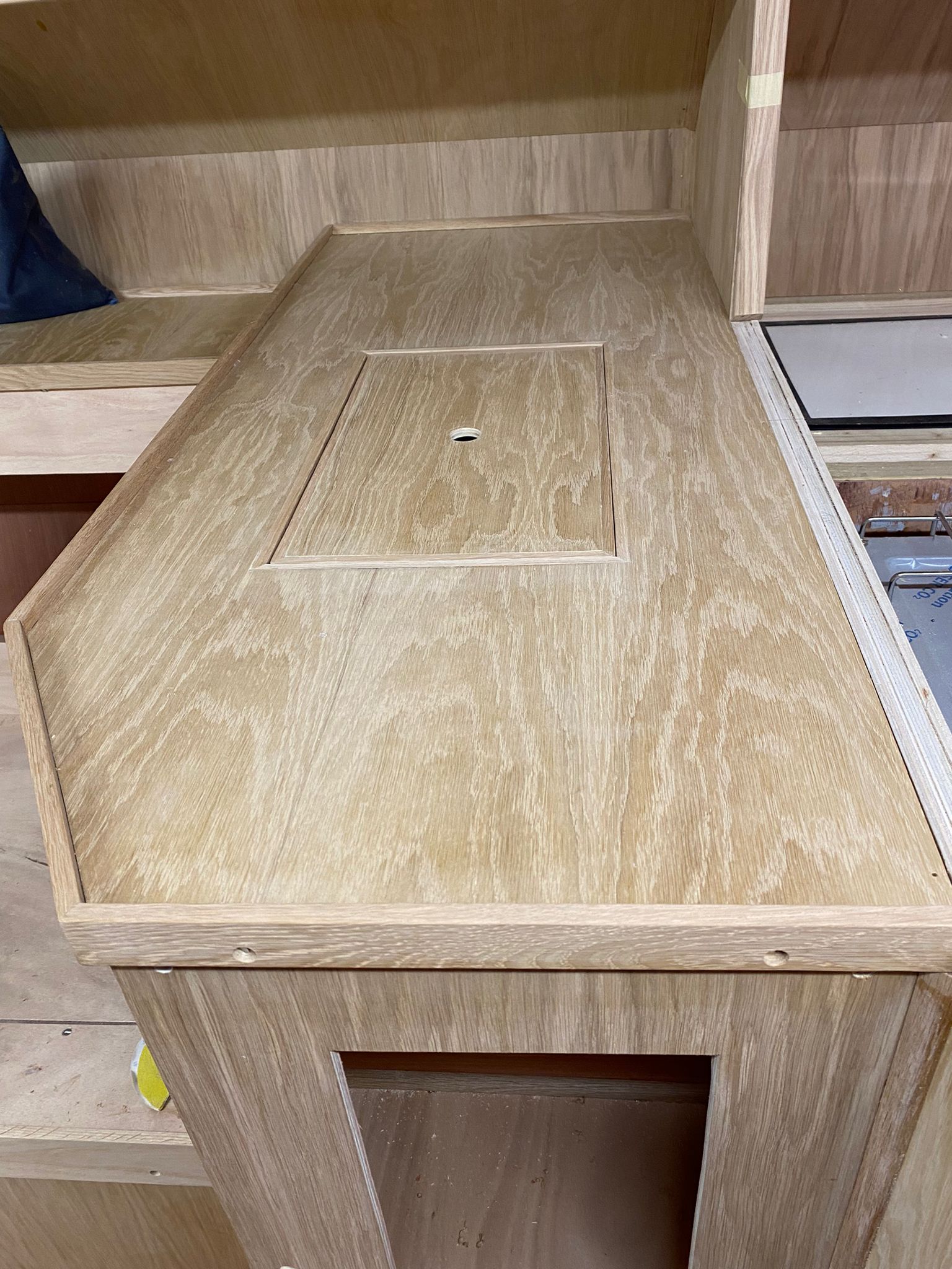 Great progress is being made on the interior fitting out and the completion is in sight. The oak faced ply has given the interior a nice light feel.
