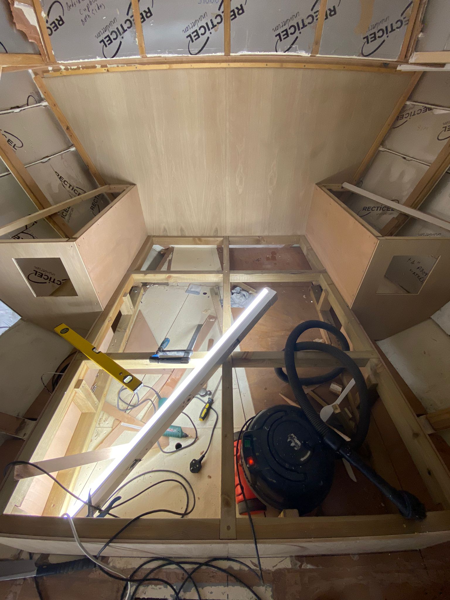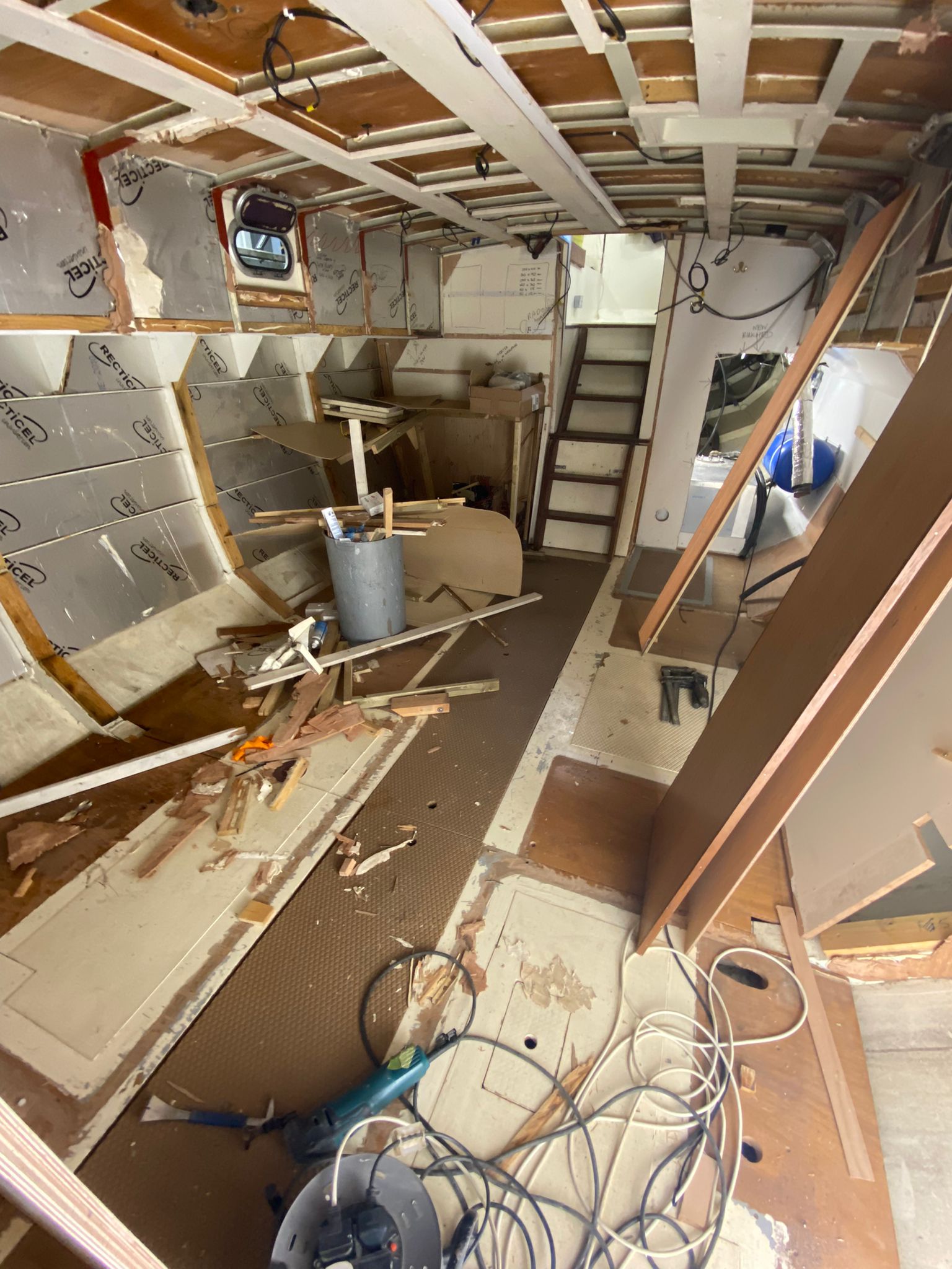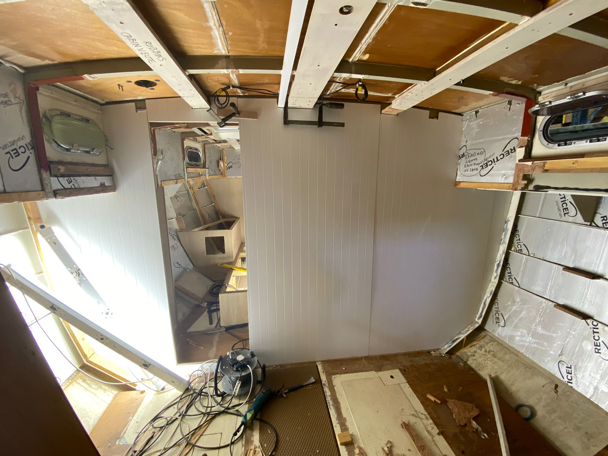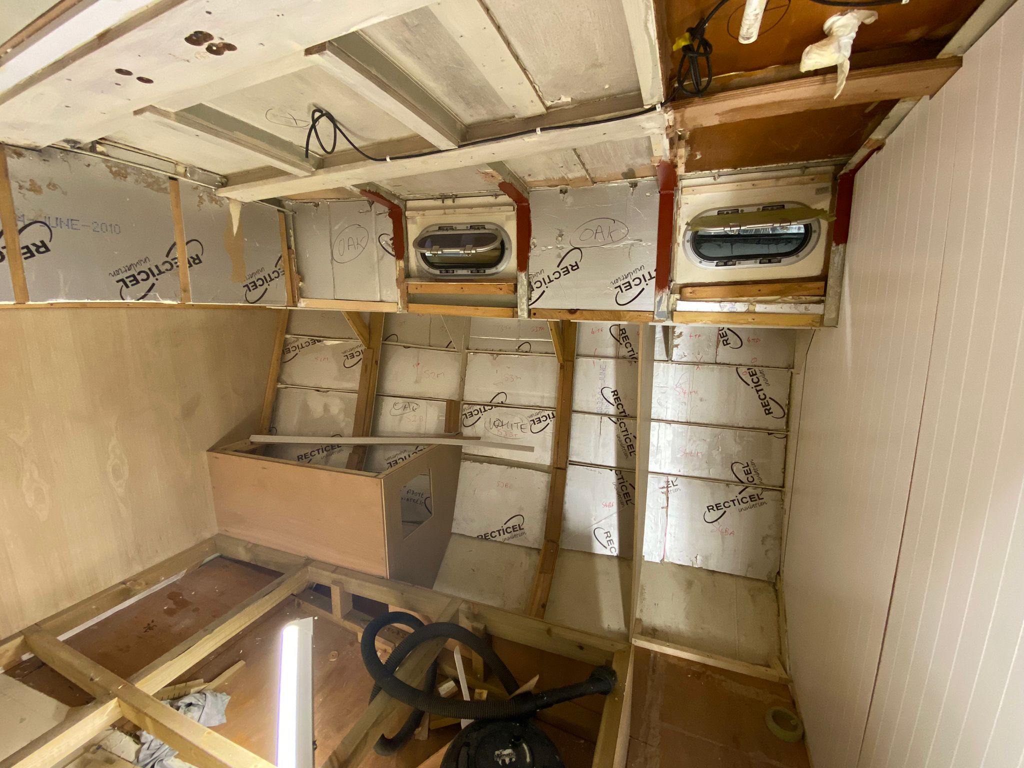 Great progress is being made on the interior fitting out and the completion is in sight. The oak faced ply has given the interior a nice light feel.