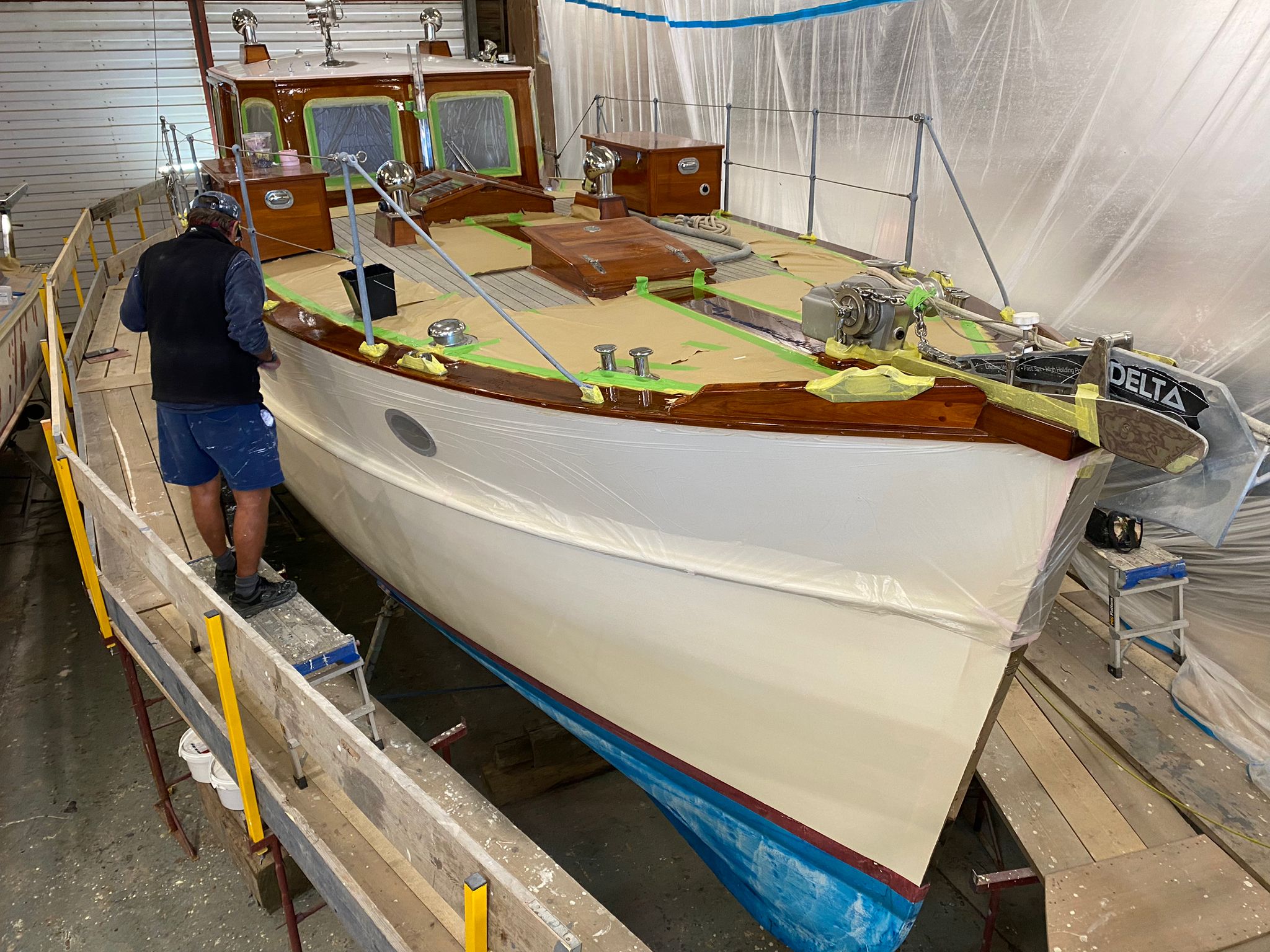 Magyar is receiving a freshen up of some of her varnish work and some routine maintenance and l was blown away by her beautiful shiny Davey & Co fittings the other day.