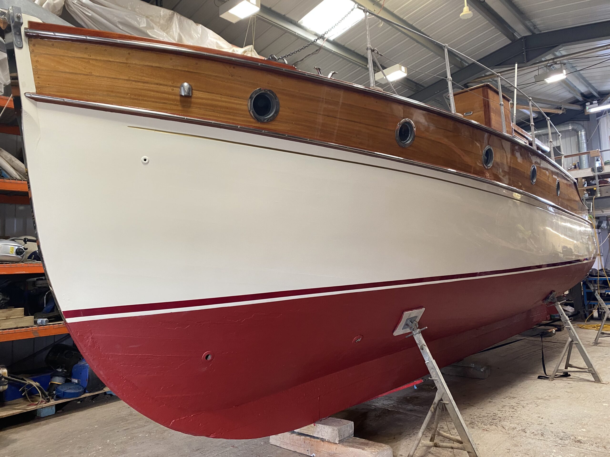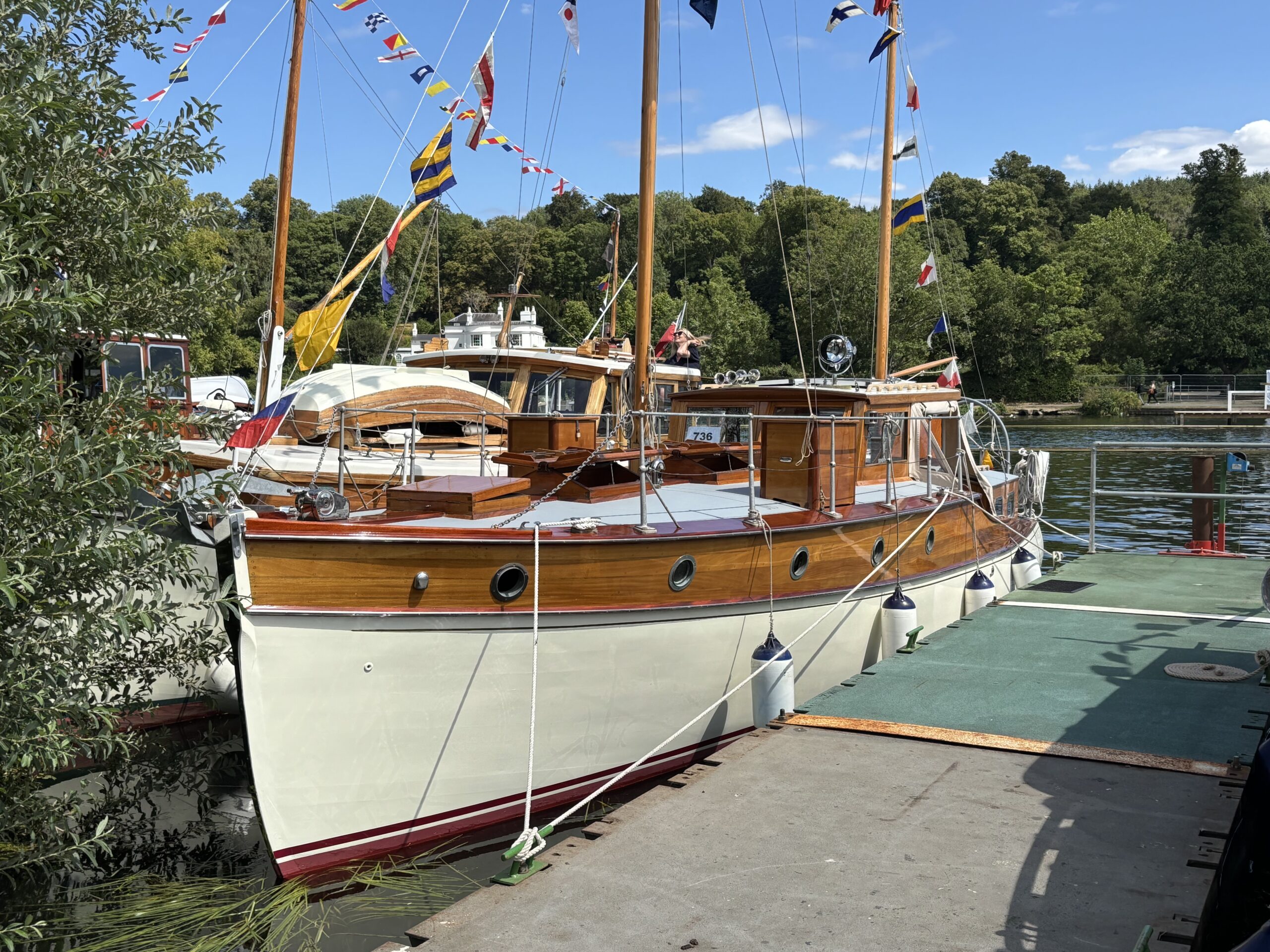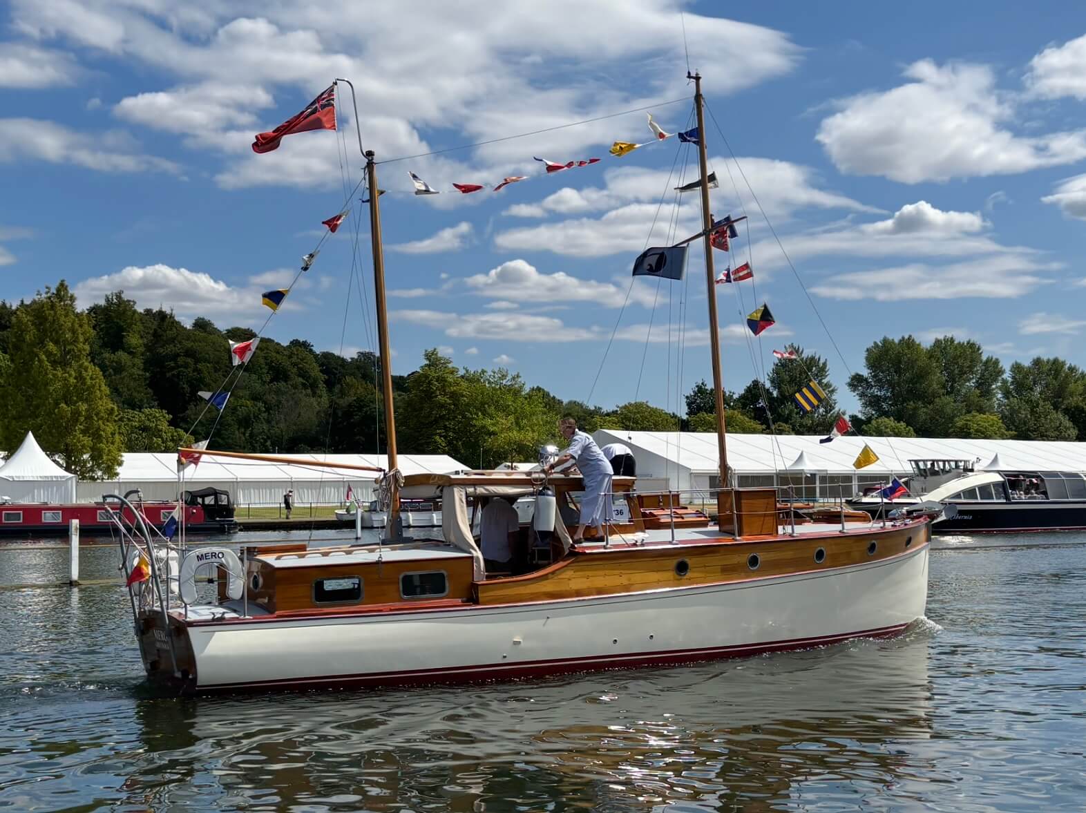 With the refreshed varnishing and painting completed Mero made her way by road transport to Henley on Thames for the Thames Traditional Boat Festival. The sun shone and she looked beautiful in this iconic location. After many years enjoyment the current owners have decided to sell her as they are buying a boat which is more suited to their future needs. She is currently being sold through www.sandemanyachtcompany.co.uk