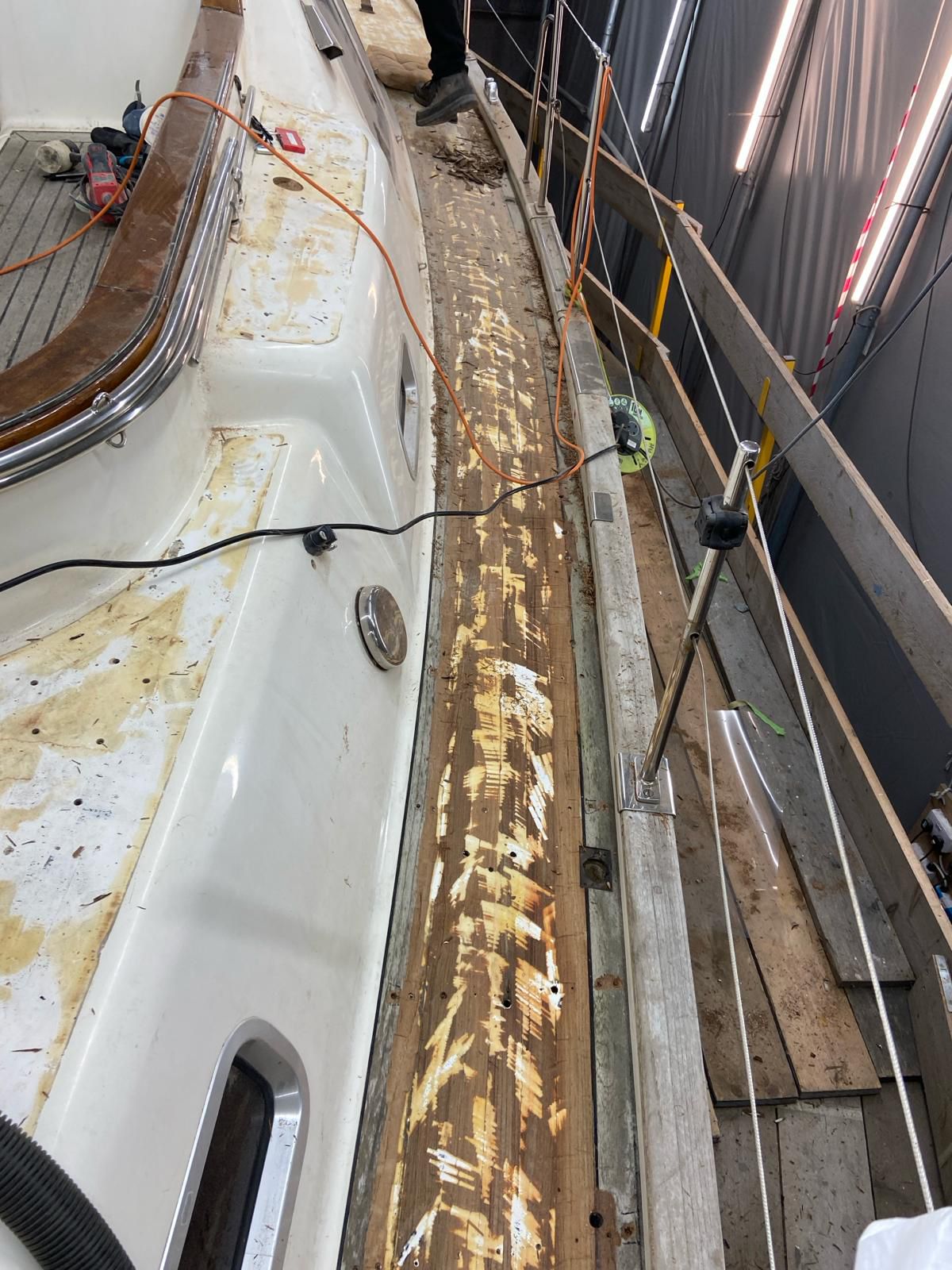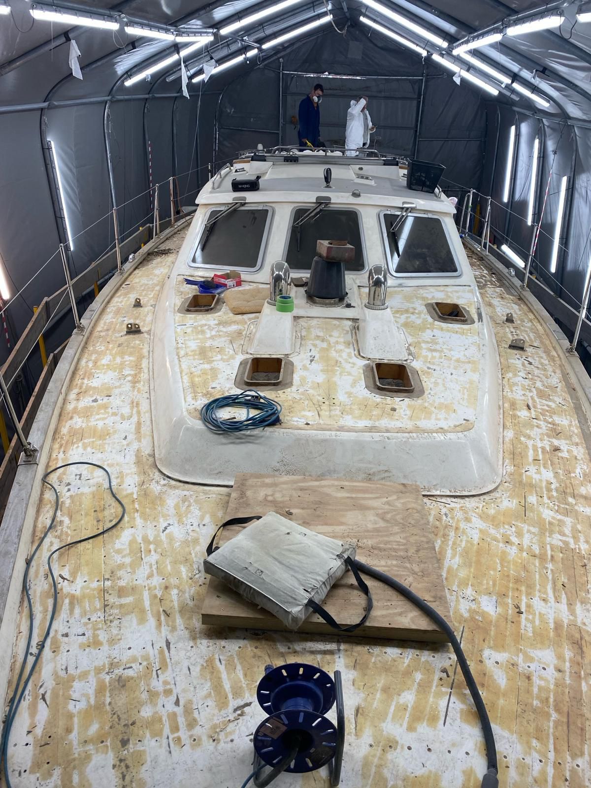 The decks were stripped back and the old screw wholes were filled and fared and sealed ready for the new simulated teak deck to be laid.