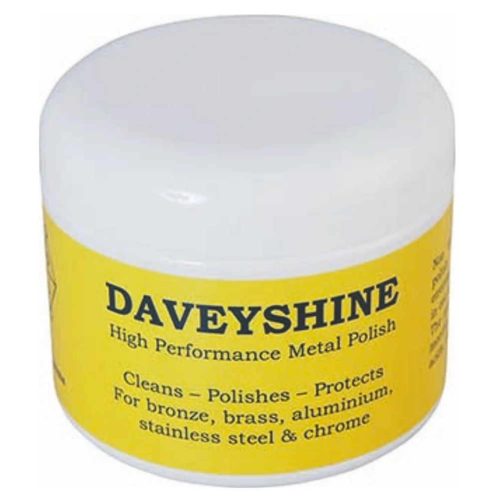 A high performance metal cleaner and polish ideally suited to bronze, brass, copper, stainless steel, aluminium, chrome and other marine metals. Its smooth paste formula is easy to apply accurately and when removed leaves a shiny surface and protective film, which delays re-tarnishing. Even heavily tarnished fittings can be restored. The handy 170 gram tub is long lasting as Daveyshine is used sparingly and the wide tub opening allows every last gram to be used.