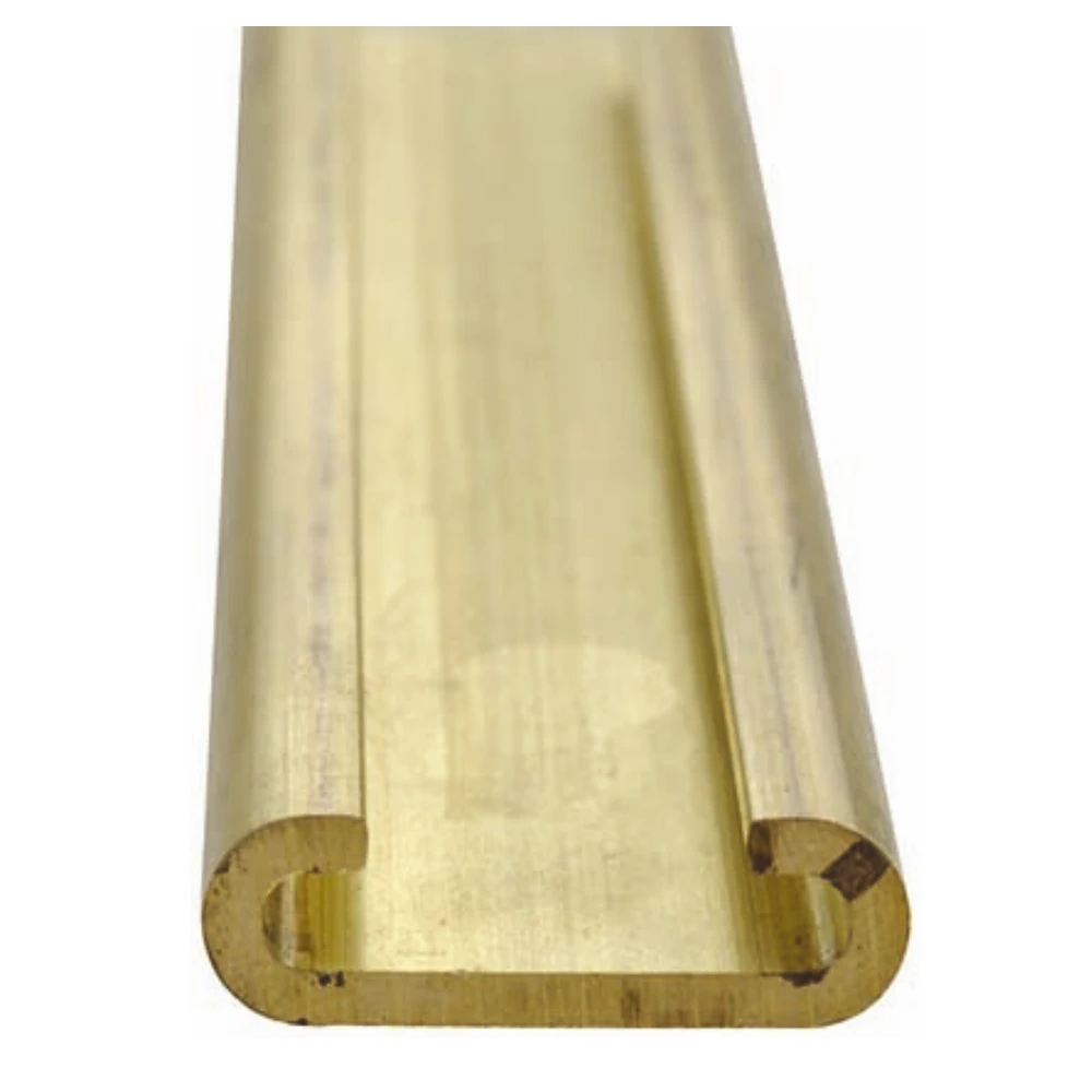 Our track is extruded from brass and supplied in undrilled lengths of approx. 3 mtrs (10 foot). The slides are formed from brass sheet or cast in gunmetal and polished.
