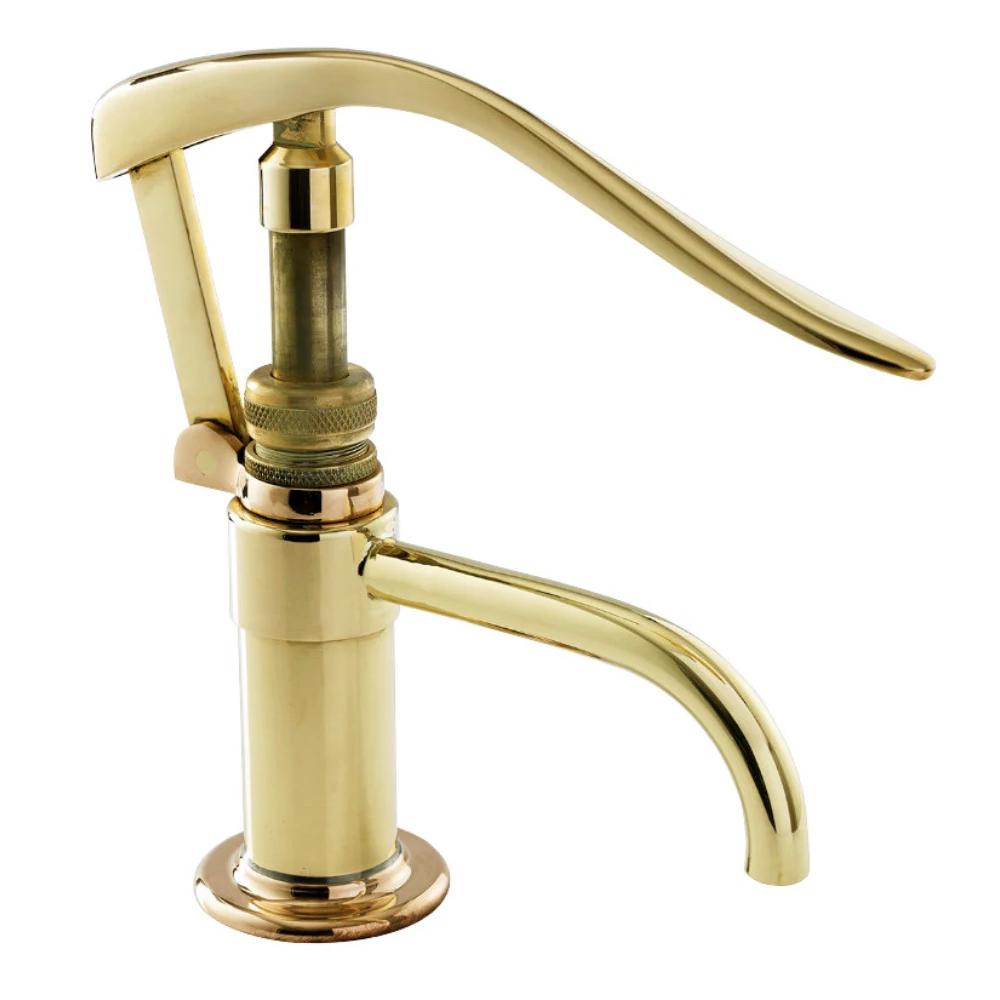 High quality traditional design lever pump in polished brass or chrome plated. Large 1 5/8″ (41mm) barrel with connection for 1/2″-3/4″ (13-19mm) pipe. For fresh or salt water.