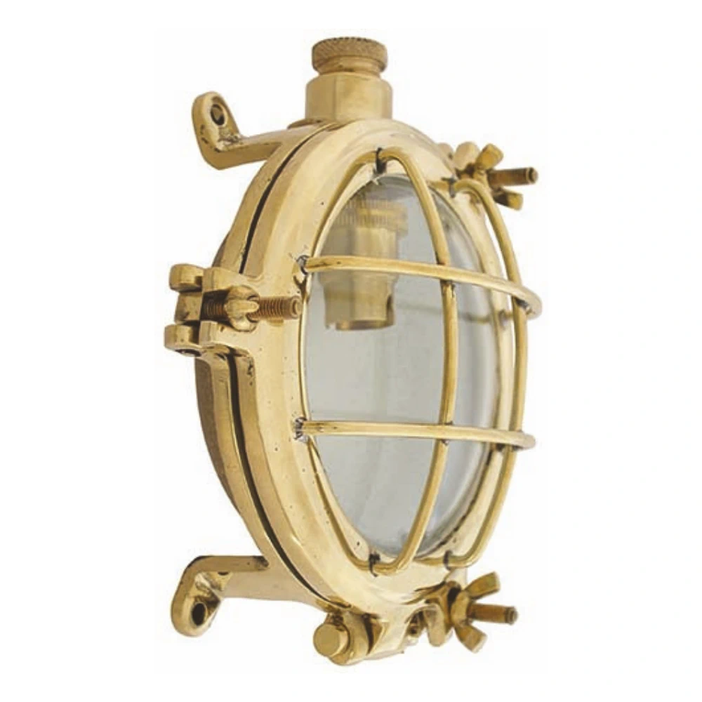 Cast in brass with traditionally wired hinged door secured with three brass swing bolts with wing nuts on to a rubber seal. Polished outer surface and fitted with clear glass, SBC bulb holder and brass cable gland. This is a