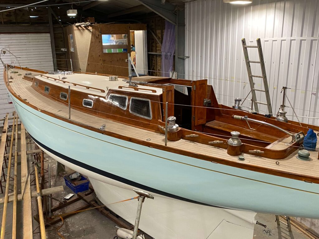 24th April 2024 With the varnish and hull works completed she has made the journey by road to Southwold where the finishing touches are being