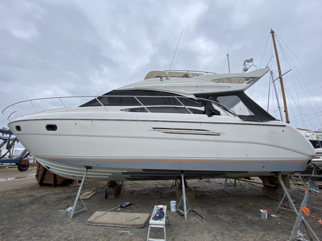 Silver Fox is a Princess 42, she has come to HMS for hull blasting and epoxy coating, routine maintenance and a new aft teak bathing
