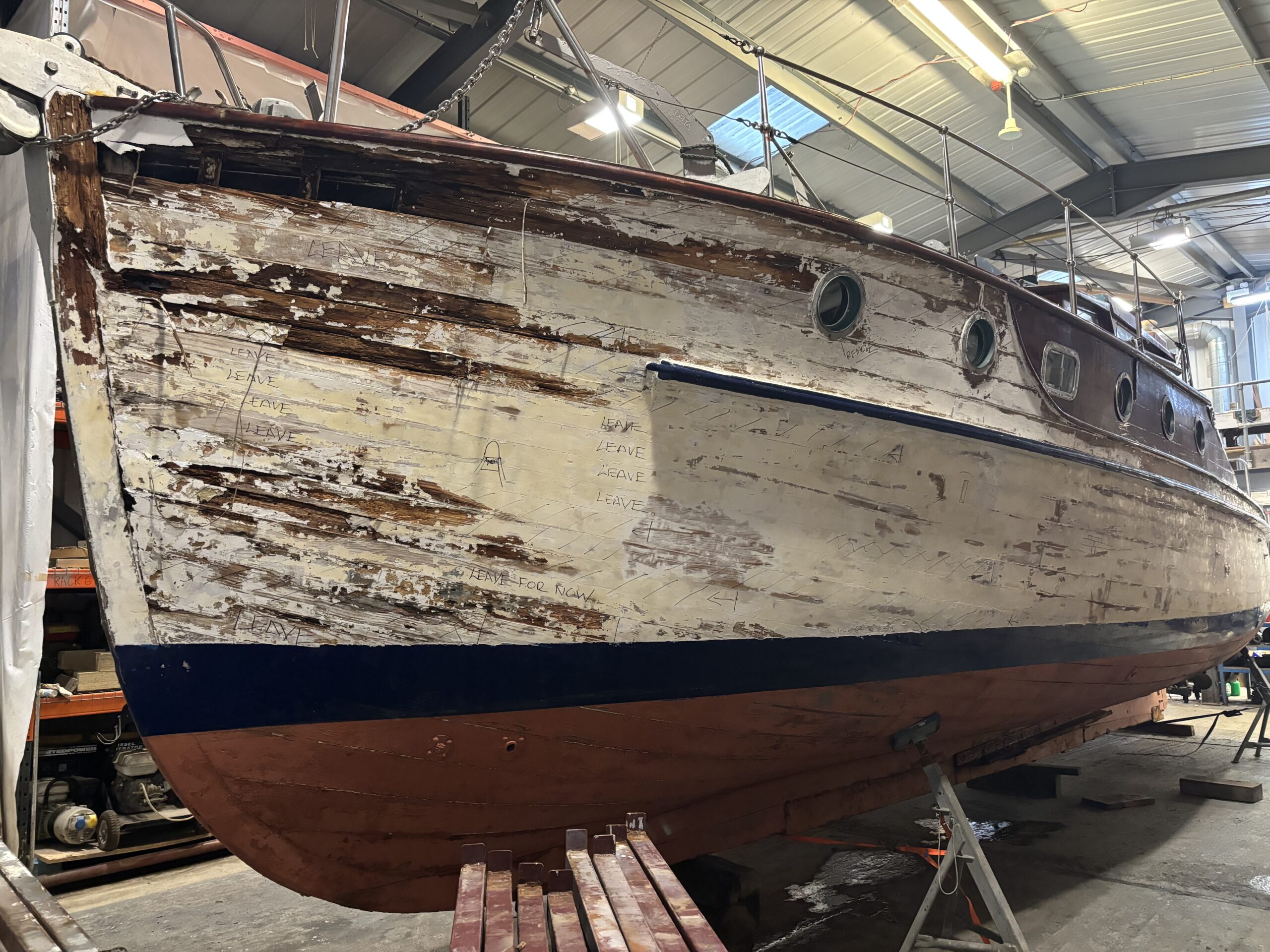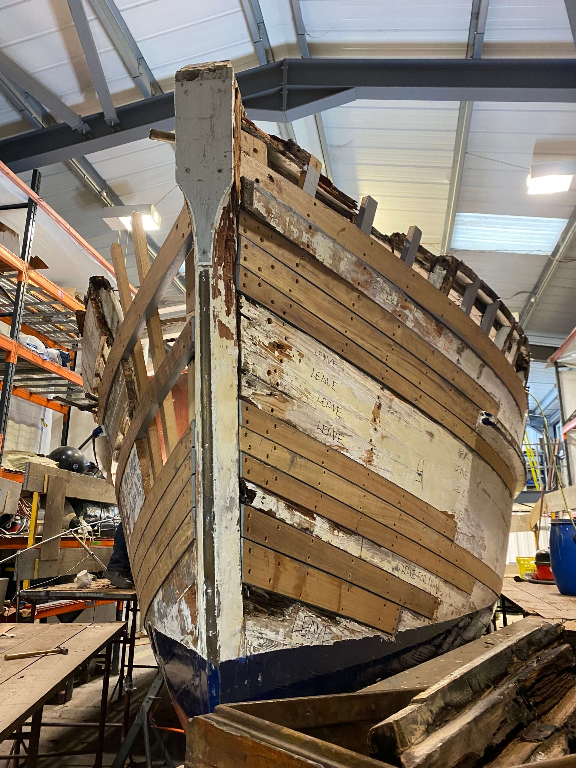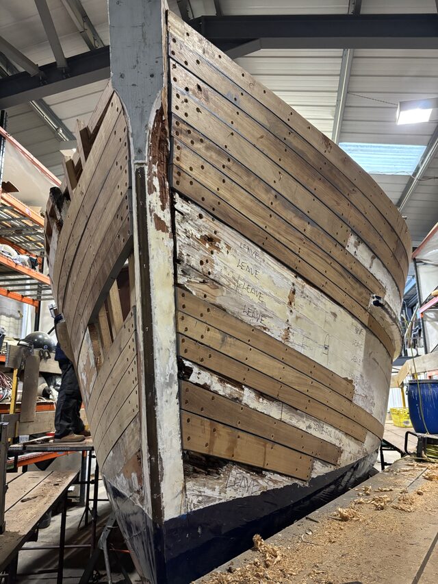 After many years out of the water Silvergare arrived to HMS and was put into shed 2 to dry out and for us to begin the next phase of her restoration. Initially the deteriorated planking was removed to allow a full inspection of the hull structure and framing.