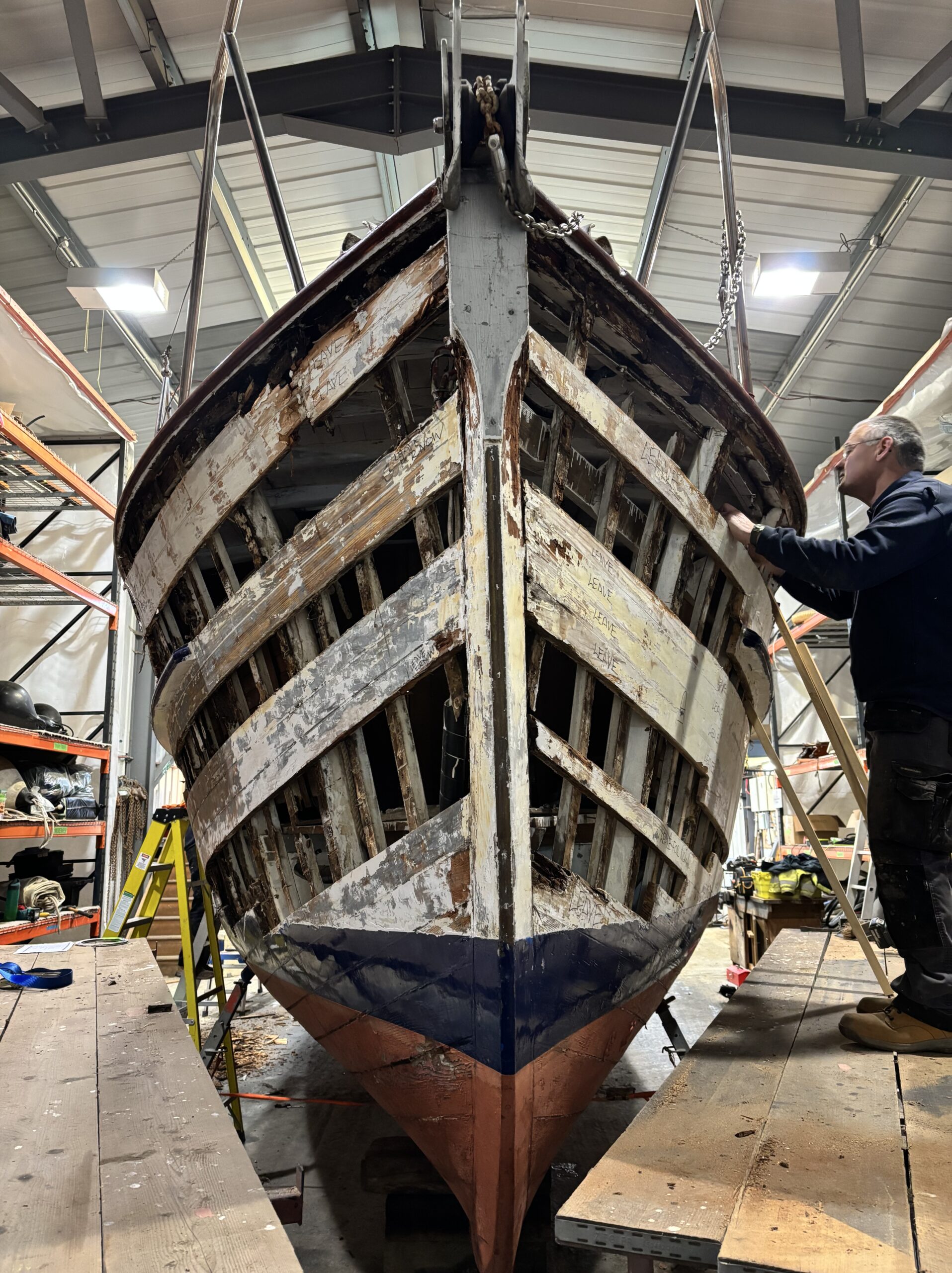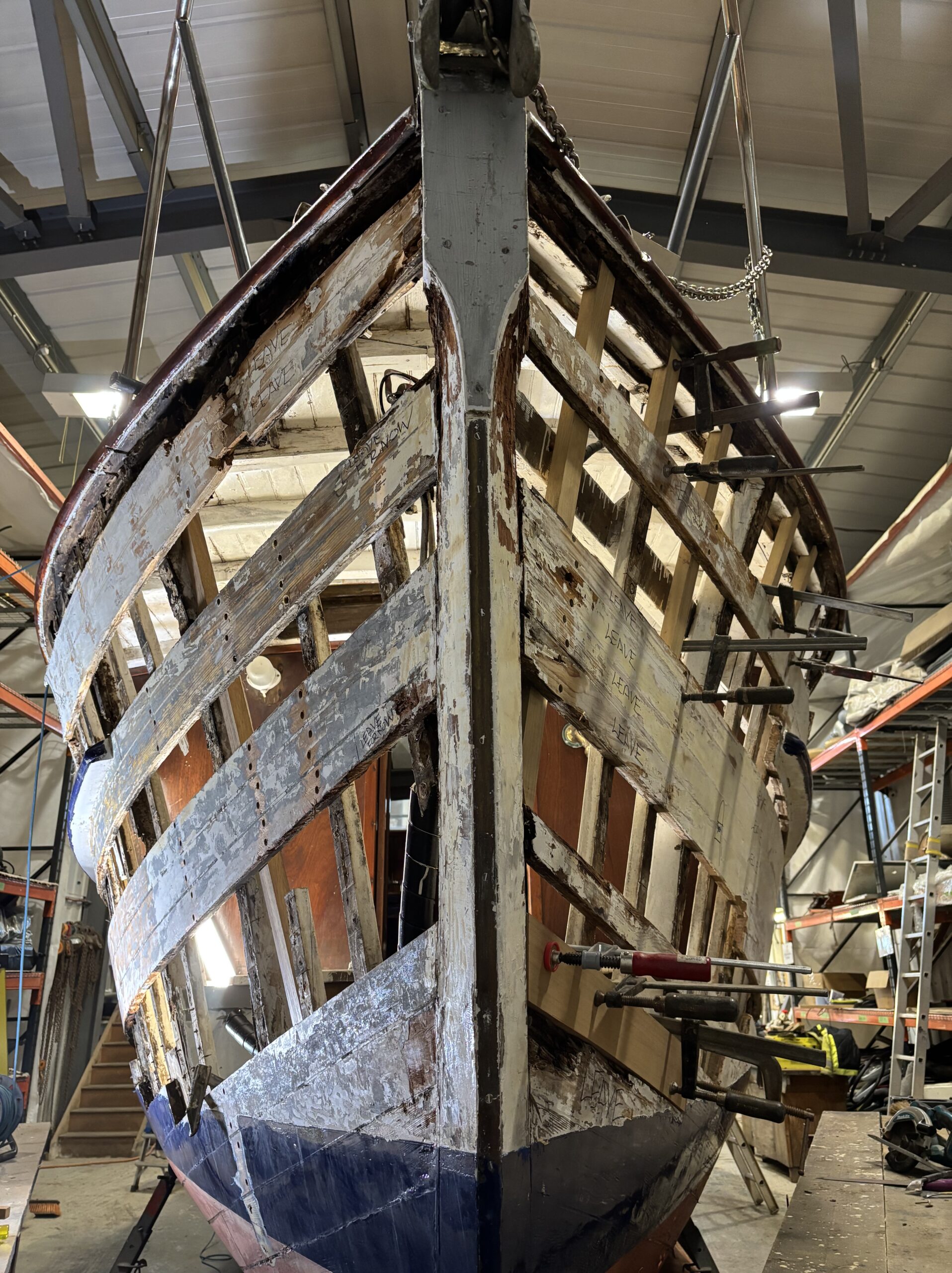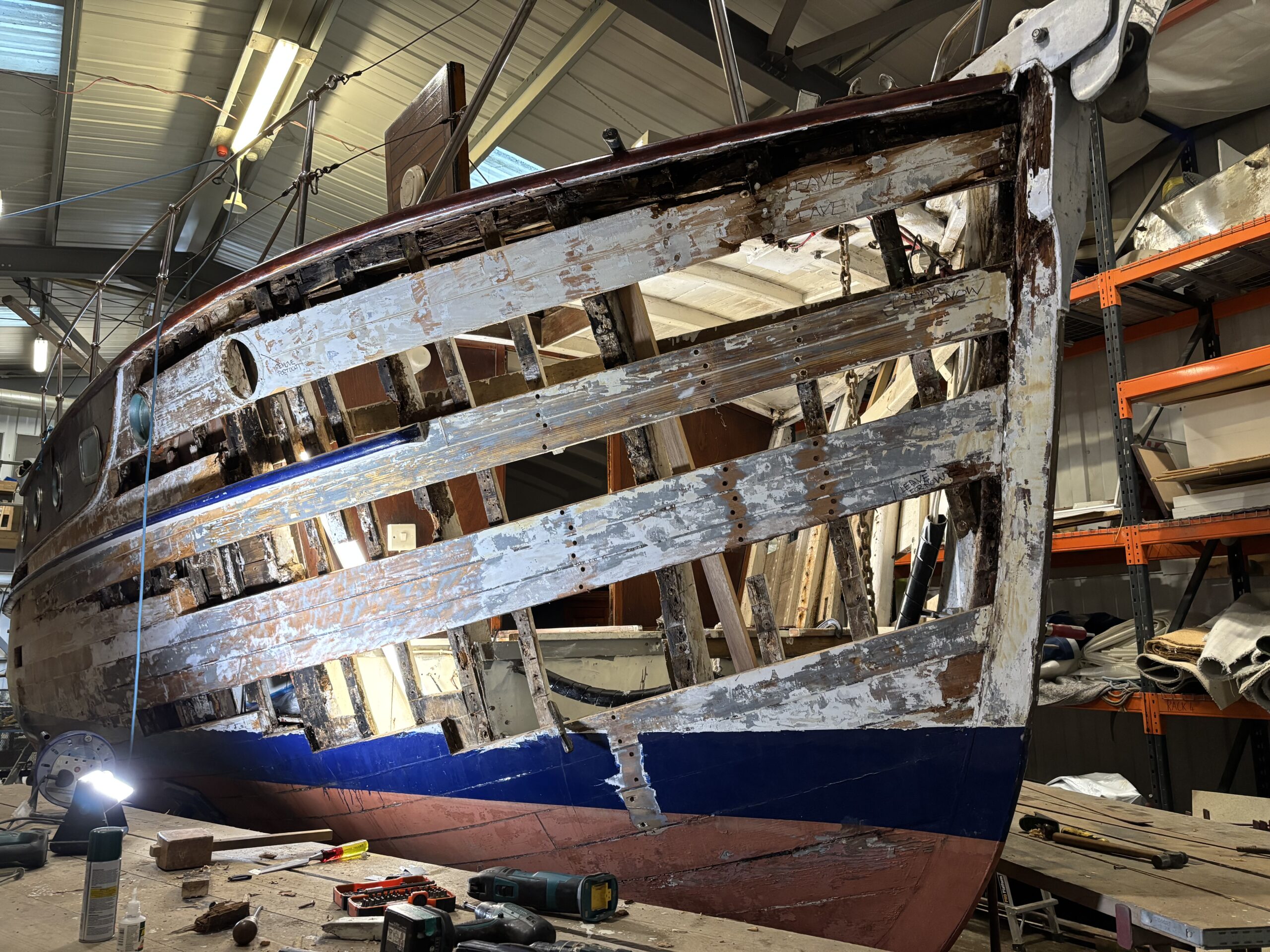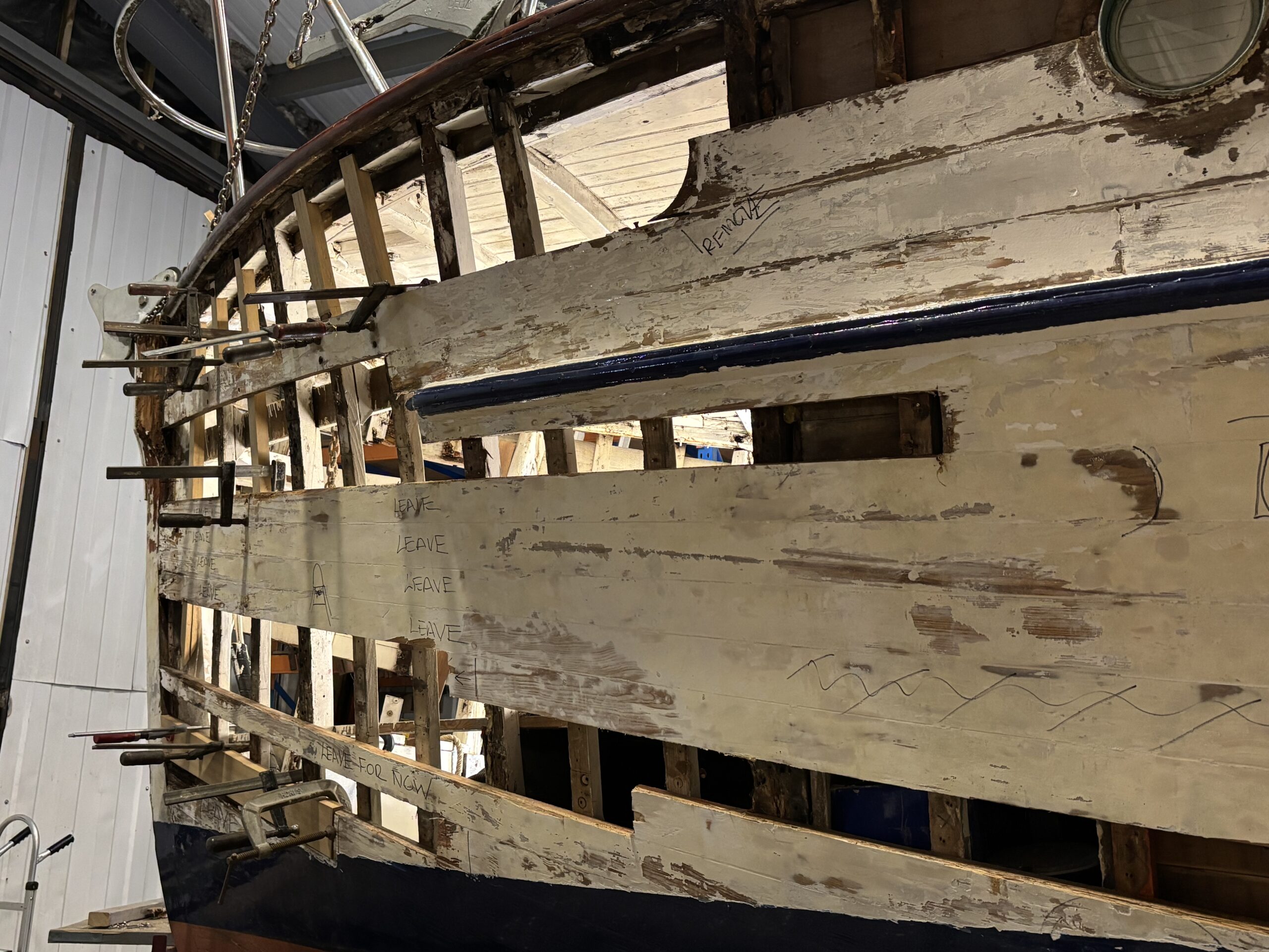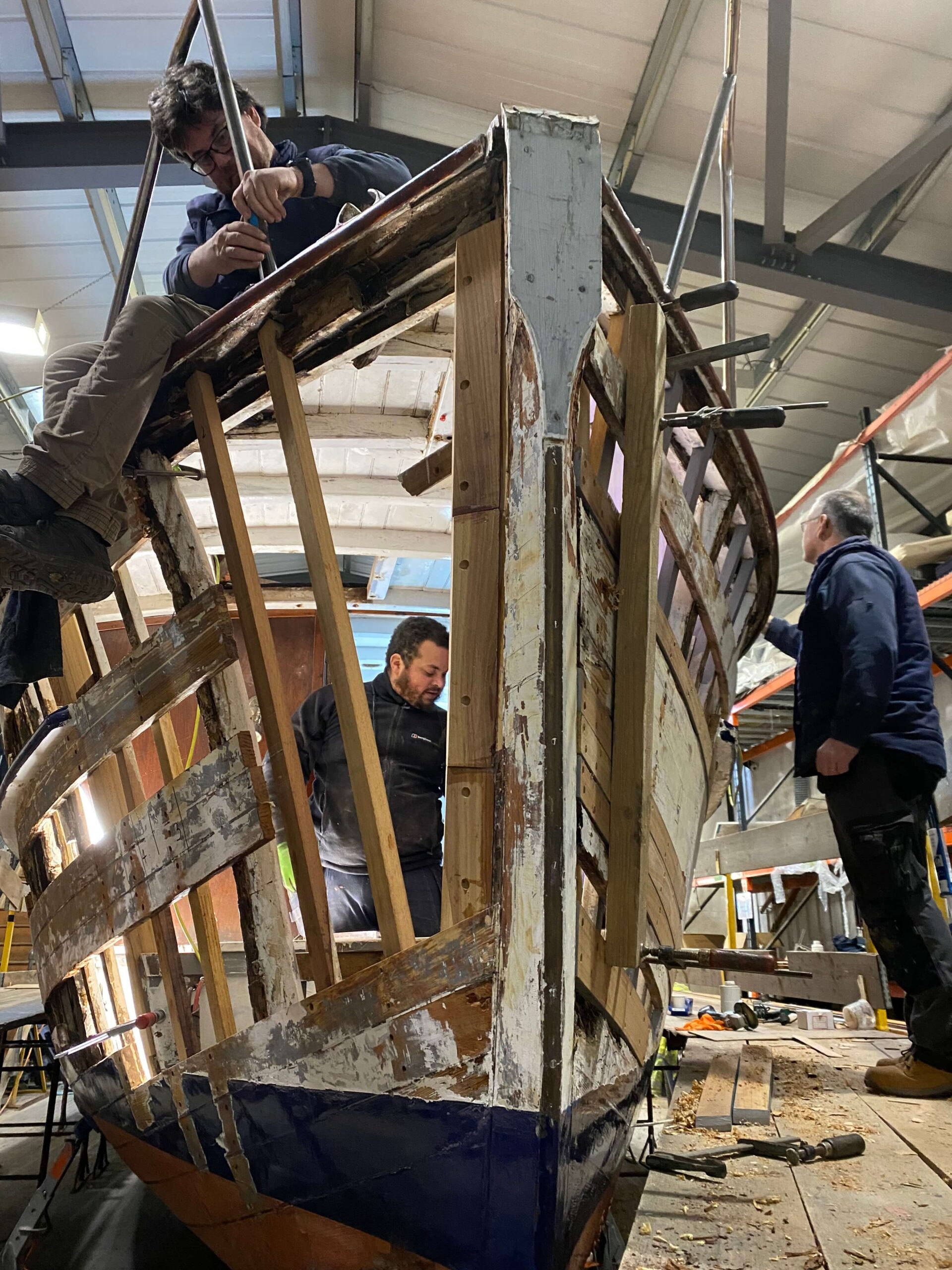 With the outer planking removed we were able to closely inspect the original frames and fastenings to determine the extent of repairs required.