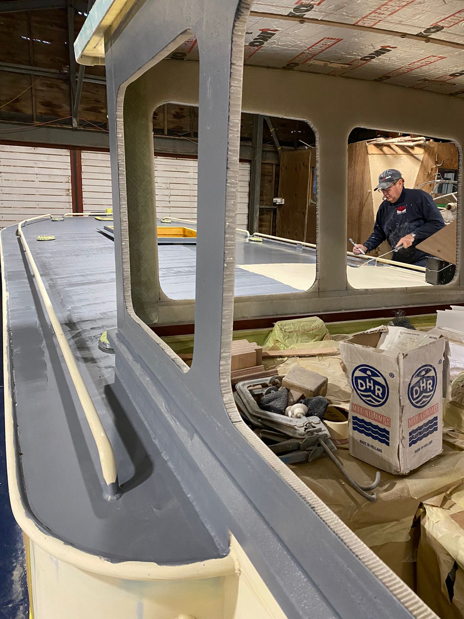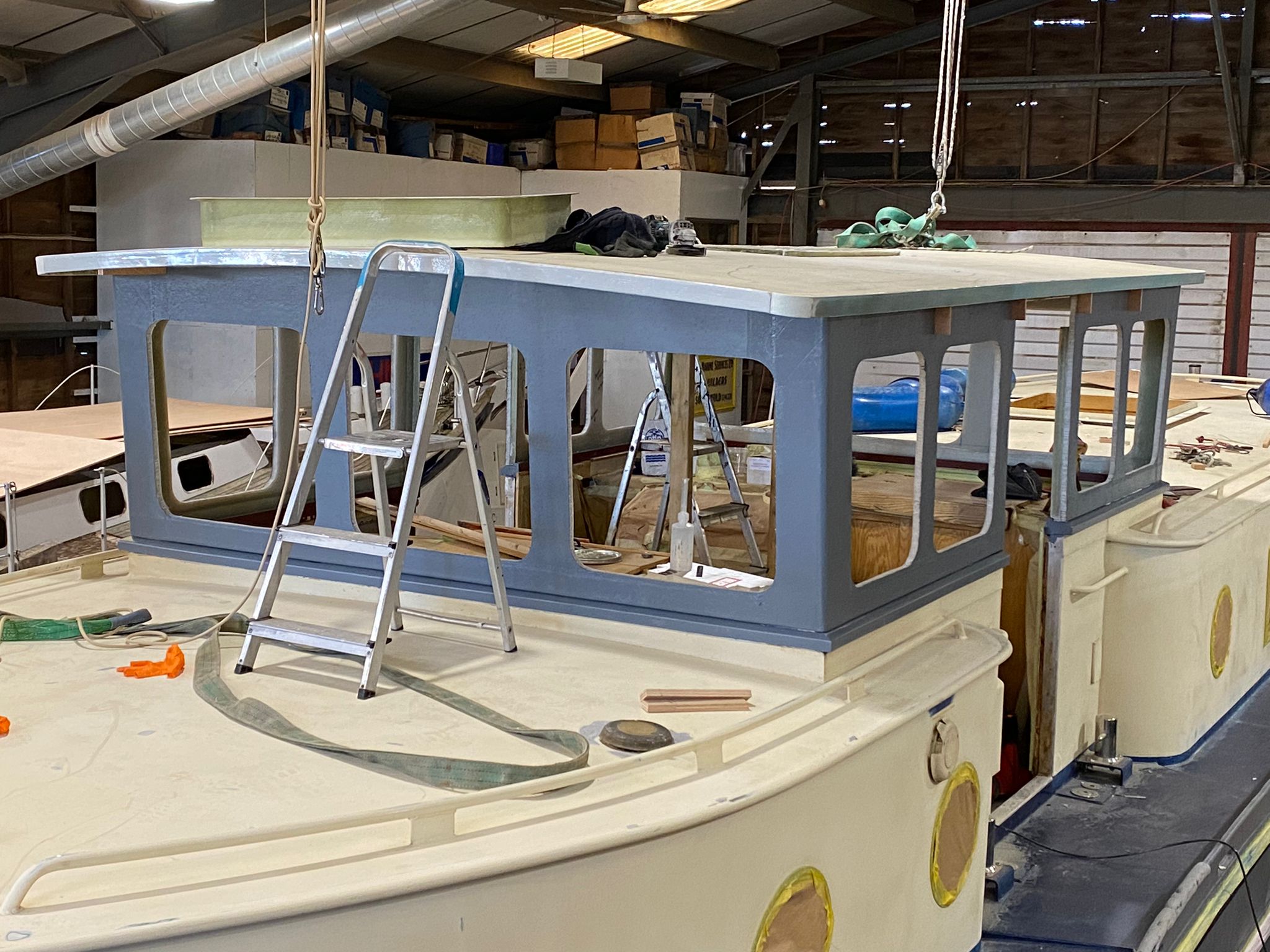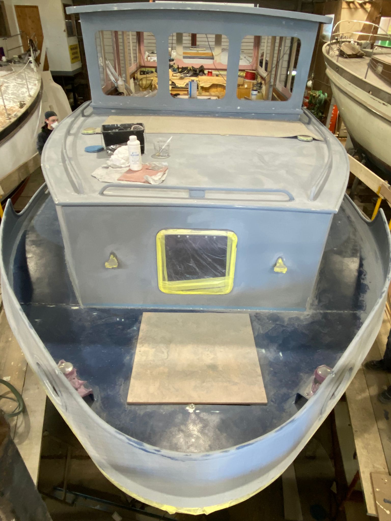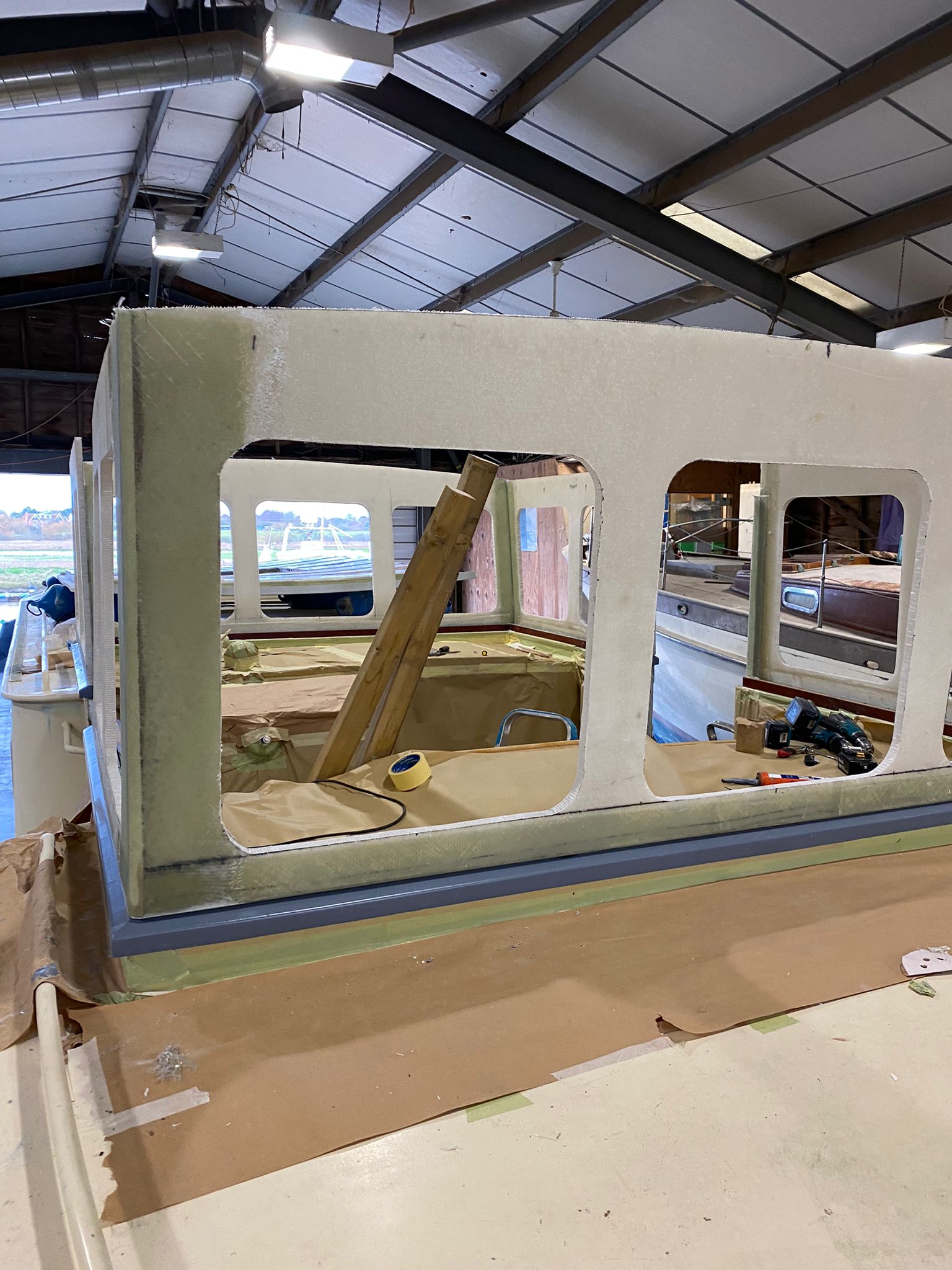 The new wheelhouse is being built using Thermhex sheet, layers of biaxall cloth, ply and resin, it is great watching it start to take shape. We had to do a mock up initially to see how it would look.