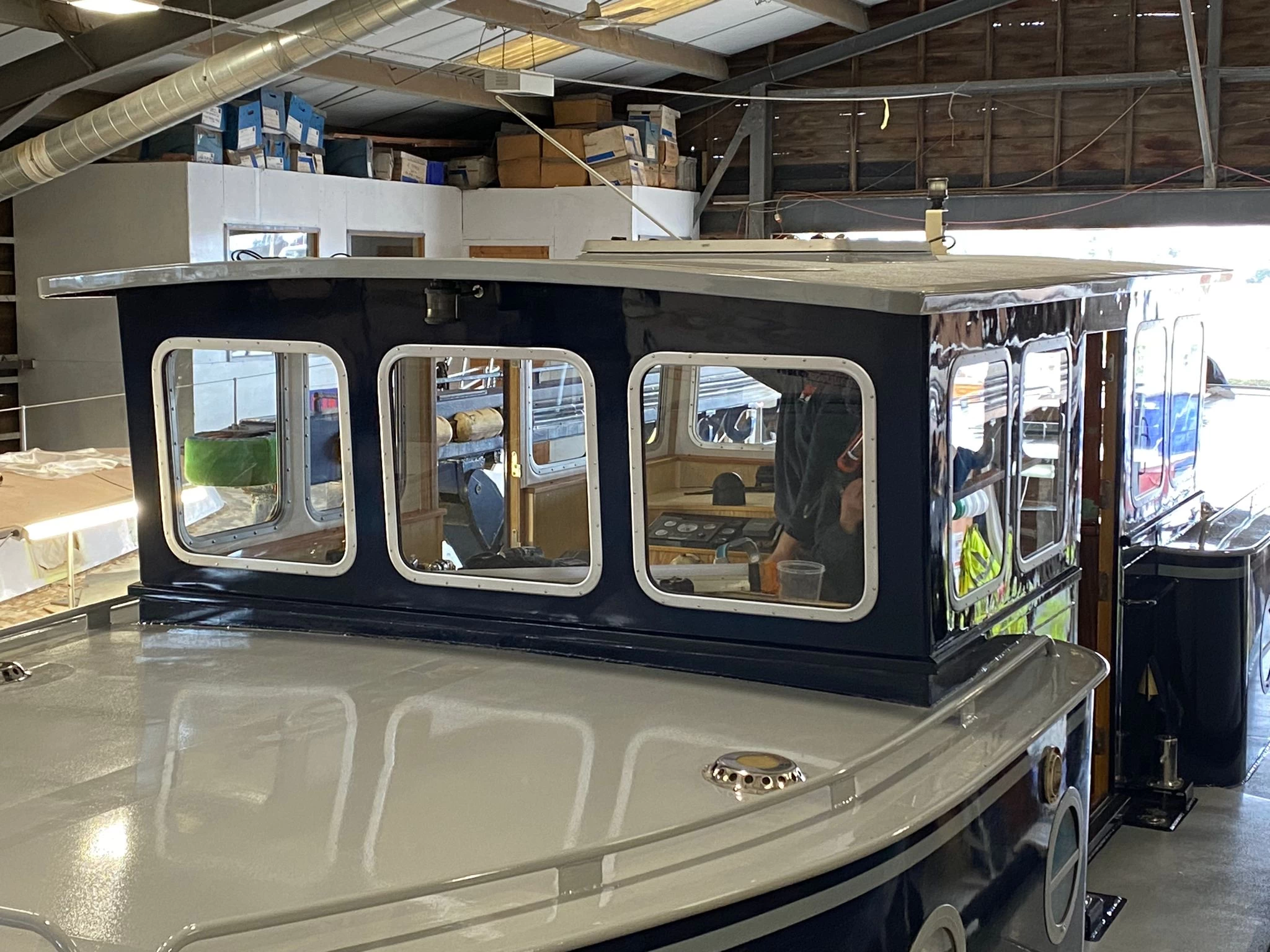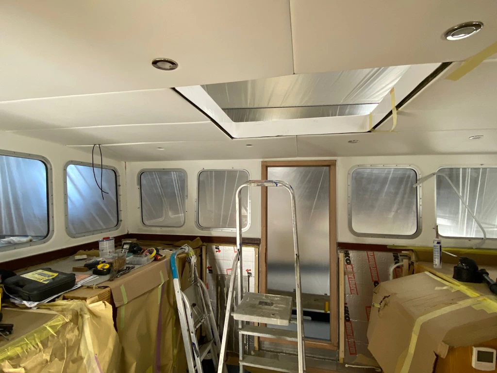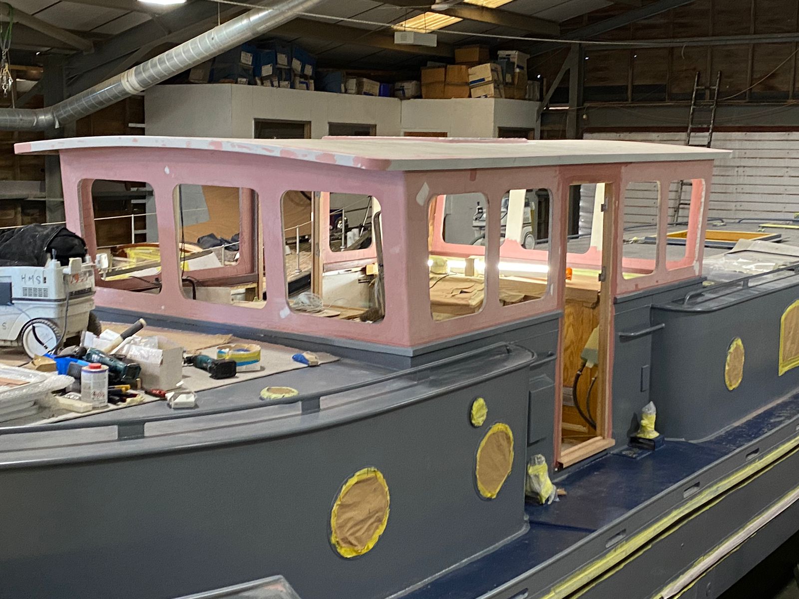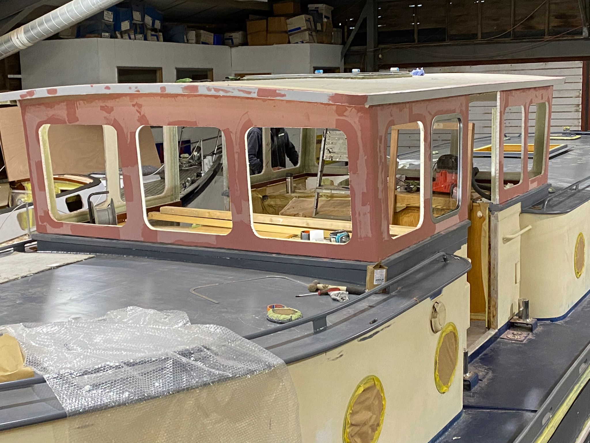 It’s been a busy time for the HMS team, great progress is being made on Tara as the deadline for completion nears. The superstructure has been painted and the windows and headlinings in the new wheelhouse are installed. The painter is currently prepping to paint the roof over the next few days.
